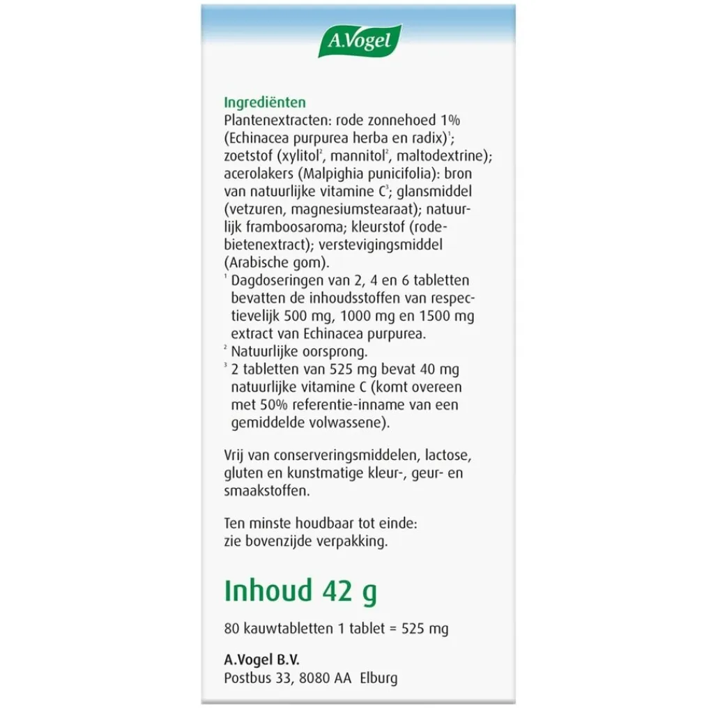Weerstand¹*¹Echinacea* Gezondheidsclaims in afwachting van Europese toelating.;Claimbeschrijving|Twee kauwtabletten A.Vogel Junior Echinaforce + vitamine C bevatten – naast 500 mg rode zonnehoed extract – 40 mg natuurlijke vitamine C. Dit ondersteunt het immuunsysteem, bevordert de opname van ijzer uit maaltijden en helpt bij de bescherming van gezonde lichaamscellen.