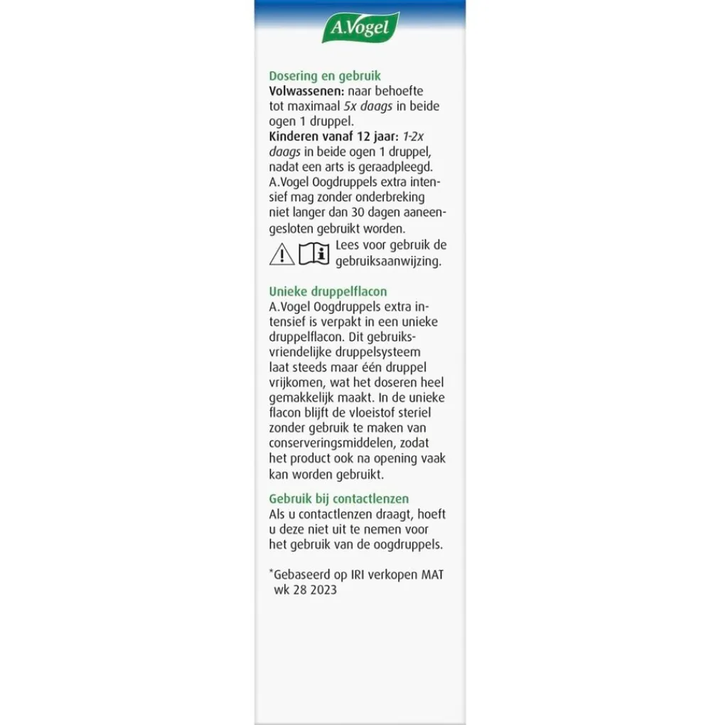 Kinderen vanaf 12 jaar: 1-2x daags in beide ogen 1 druppel, nadat een arts is geraadpleegd. A.Vogel Oogdruppels extra intensief mag zonder onderbreking niet langer dan 30 dagen aaneengesloten gebruikt worden.