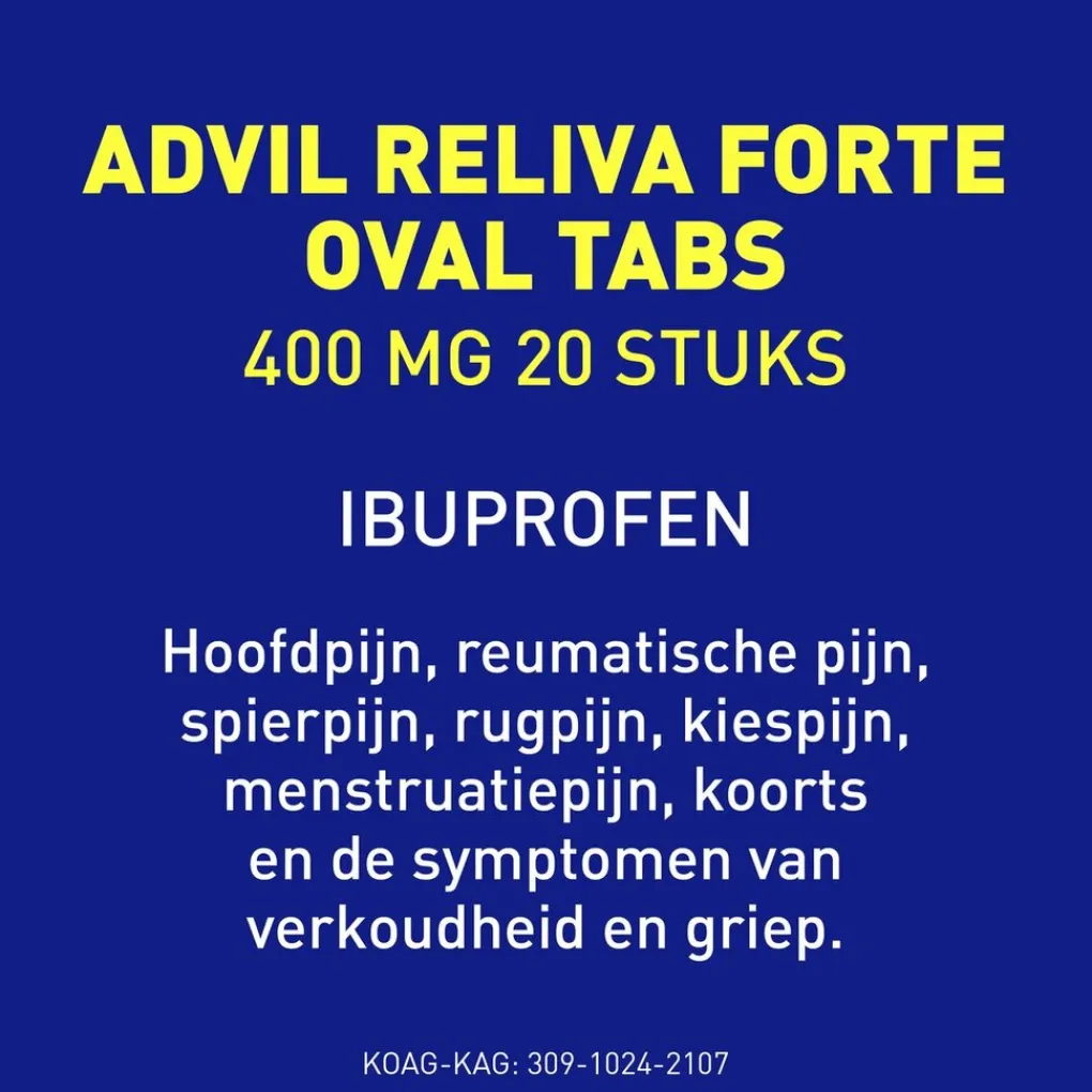 Advil Reliva Forte 400mg Oval-Tabs zijn geschikt voor onder andere hoofdpijn, rugpijn, kiespijn, menstruatiepijn, reumatische pijn, spierpijn, verlichting van koorts en de symptomen van verkoudheid en griep.
