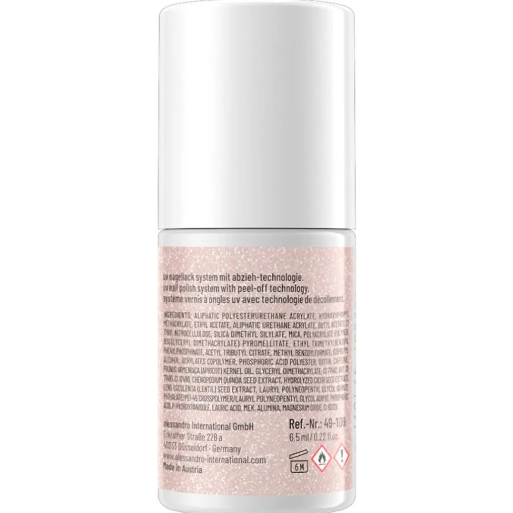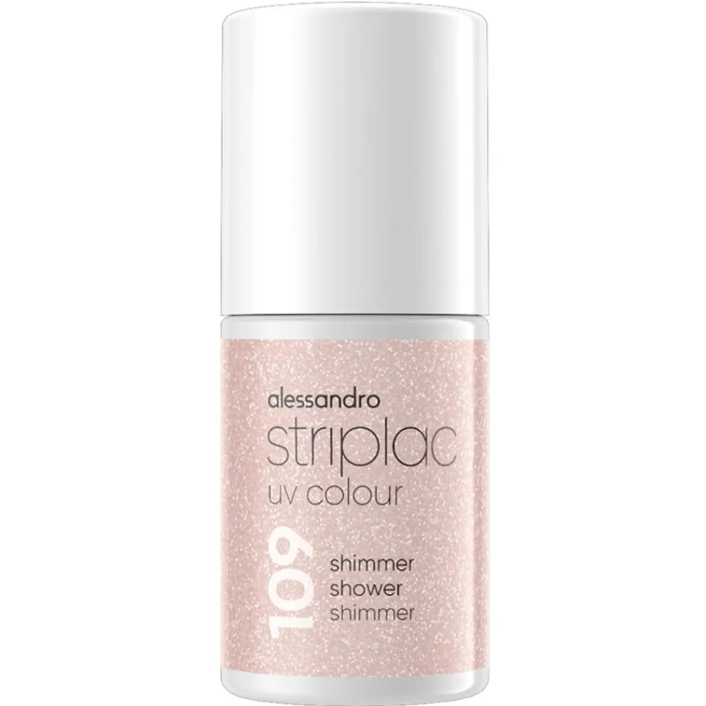 Alessandro Striplac UV Colour 109 Shimmer Shower Nagellak is een champagnetint vol fijne zilveren glitters die je nagels een subtiele sparkle geven.