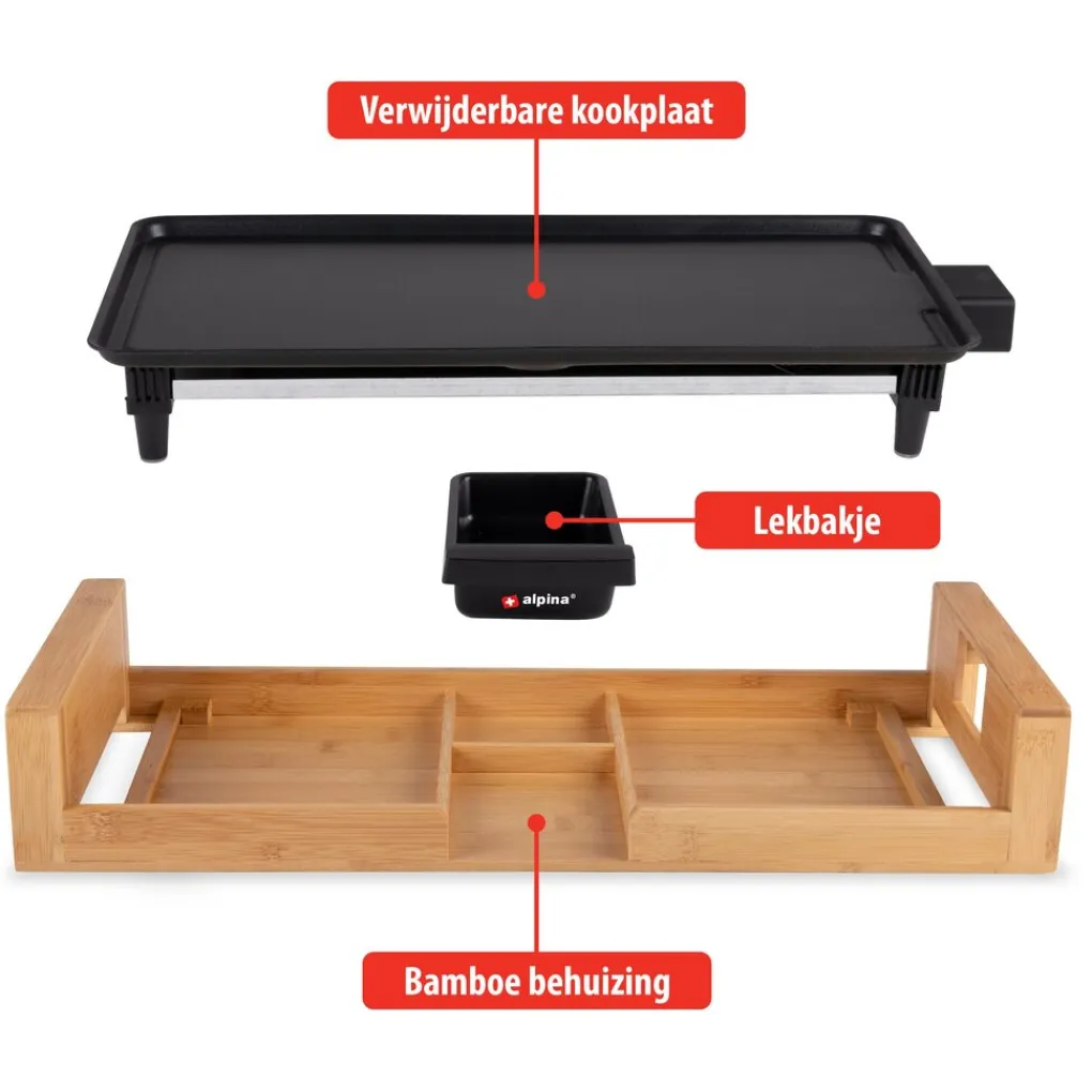 De alpina teppanyaki bakplaat heeft een onderstel van echte bamboo. Dit materiaal is niet alleen stijlvol, maar ook duurzaam en slijtvast. Daarnaast wordt bamboe niet snel warm wanneer de grillplaat in gebruik is. Zo kun je hem zelfs tijdens het bakken verplaatsen zonder daarbij brandwonden op te lopen. Tot slot staat bamboe er ook om bekend dat het vrijwel niet vervormd door hitte. Hierdoor gaat de teppanyaki bakplaat langer mee dan vergelijkbare modellen en kun je nog jaren genieten van gezellige etentjes met vrienden en familie.