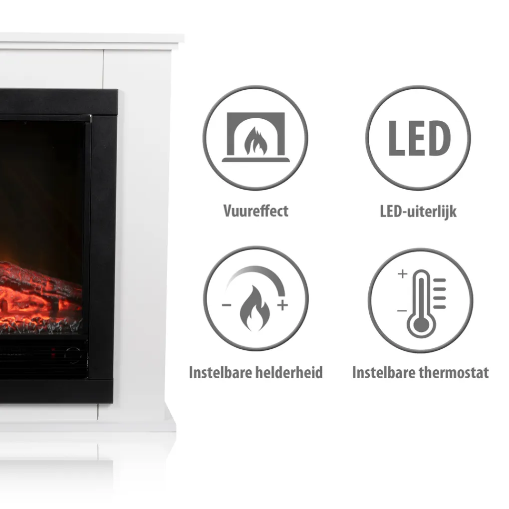Stijlvolle elektrische haardDe elektrische haard wordt omhuld door een mooie witte schouw die je interieur instant een ander aanzicht geeft. Hij heeft een modern klassieke uitstraling en past daarom in elk interieur. Je kunt hem overal neerzetten waar een geaard stopcontact voor handen is. Zet hem bijvoorbeeld tegen een witte muur. Dat creëert rust en maakt dat de haard met schoorsteenmantel een geheel vormt met de achtergrond. Je kunt hem ook juist tegen een gekleurde muur plaatsen zodat hij echt opvalt en je de focus op deze mooie sfeerhaard legt.
