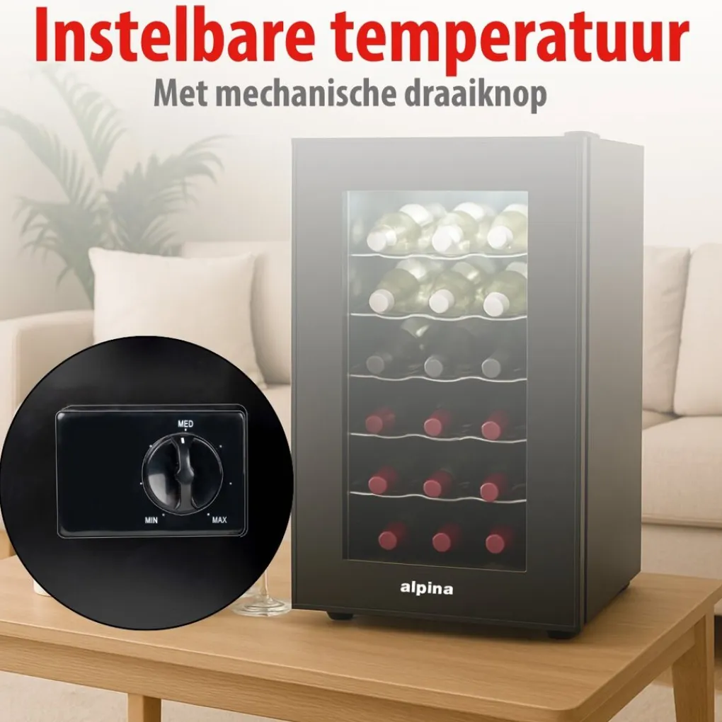 De alpina wijnklimaatkast heeft een mechanische bediening met instelbare thermostaat. De wijnkoelkast kan worden ingesteld op een minimale temperatuur van 11°C en een maximale temperatuur van 22°C. Het is belangrijk dat je de wijnkoelkast wel in een goede kamertemperatuur bewaard van bij voorkeur 25°C. De temperatuur regelaar van de klimaatkast bevindt zich aan de achterkant van het apparaat. Uiterst gezien kun je de wijnklimaatkast bewaren in temperaturen van 16°C tot 32°C. Bewaar rode wijnen bij voorkeur op een temperatuur van 15.5°C tot 18°C , droge en zoete witte wijnen op een temperatuur van 11°C tot 15°C en oudere wijnen bij een temperatuur van maximaal 13°C .
