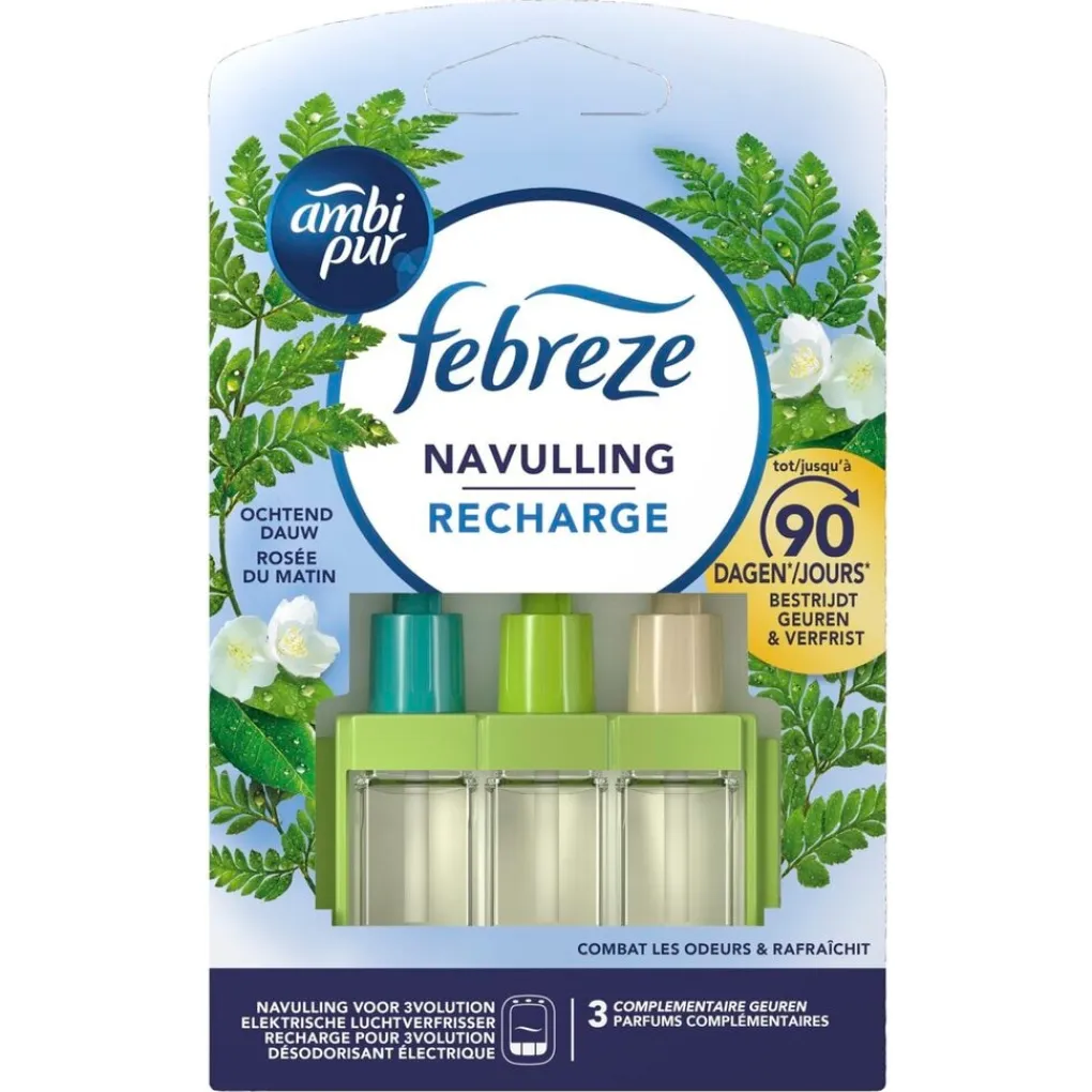 De Ambi Pur Ochtenddauw 3Volution Elektrische Luchtverfrisser Navulling bestrijdt voortdurend geurtjes en wisselt tussen drie elkaar aanvullende geuren voor een frisheid die je blijft ruiken.