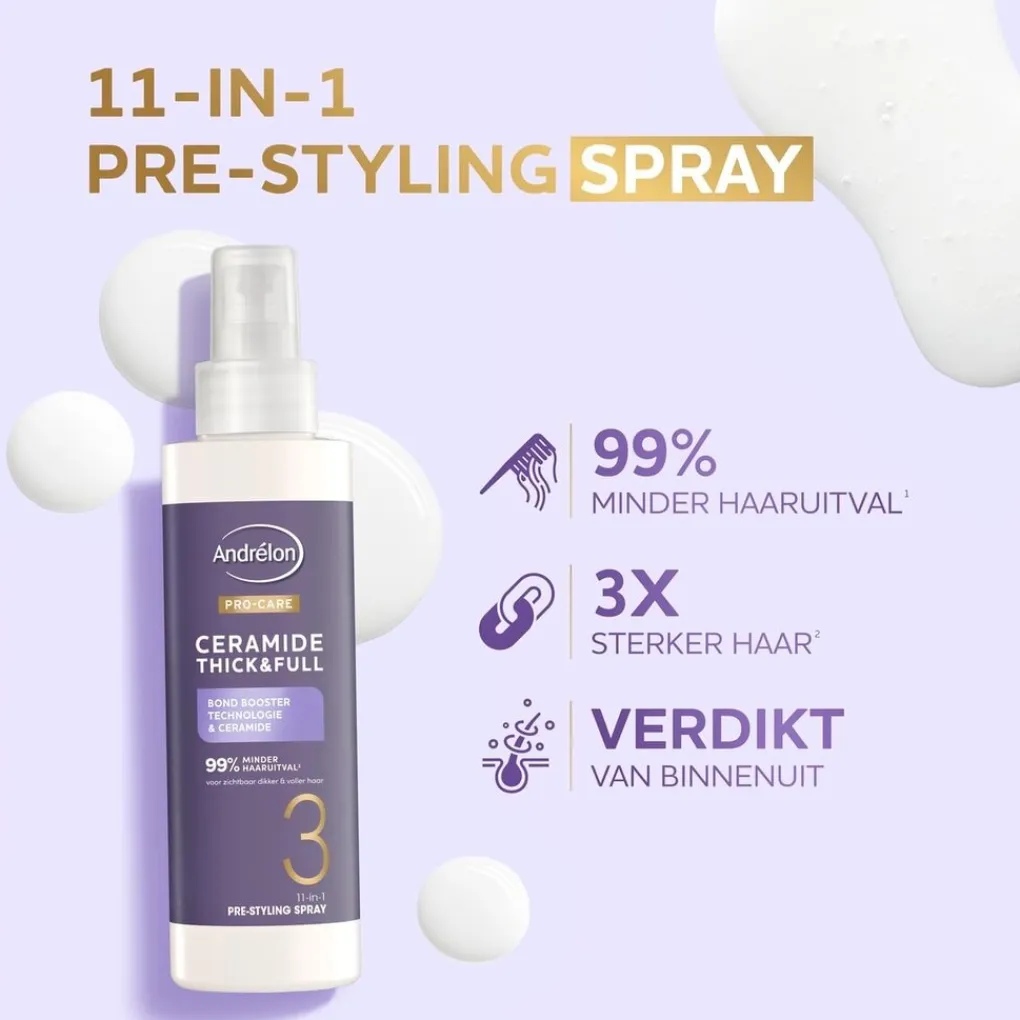 •Andrélon Pro-Care Ceramide Thick & Full Pre-Styling Spray is voor dun haar