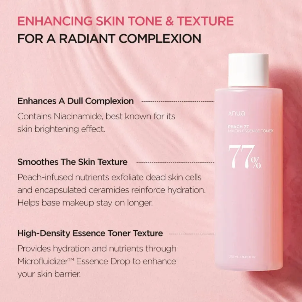 Een verfrissende en verhelderende essence-toner met 77% perzikextract en niacinamide, ontworpen om de huid te hydrateren, op te helderen en een gezonde glow te geven. Deze toner combineert de lichtheid van een toner met de voedende werking van een essence, waardoor het perfect is voor een stralende, egale huid. Ideaal voor dagelijks gebruik en geschikt voor alle huidtypen, inclusief de doffe of vermoeide huid.
