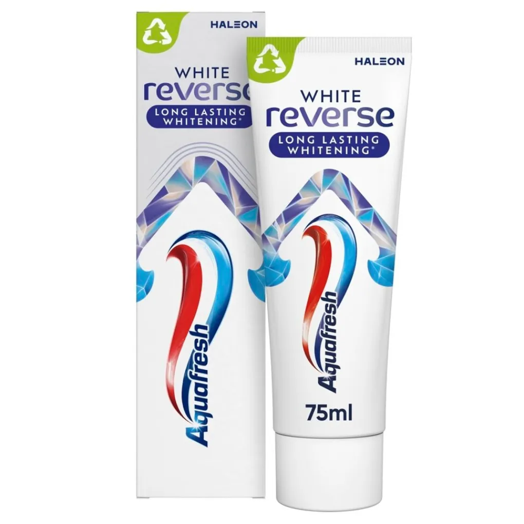 De Aquafresh White Reverse Long Lasting Strengthening Tandpasta is de beste whitening tandpasta van Aquafresh. Hij biedt tot drie keer effectievere vlekverwijdering* en herstelt de sterkte van je glazuur.