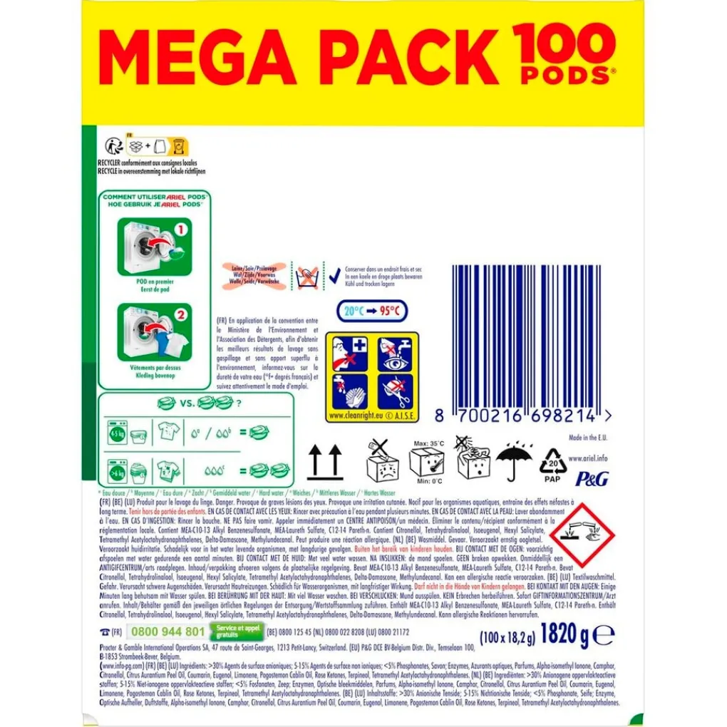 Ariel Original 3-in-1 Pods worden in Frankrijk gemaakt. Bewaar de wasmiddelcapsules altijd buiten het bereik van kinderen.