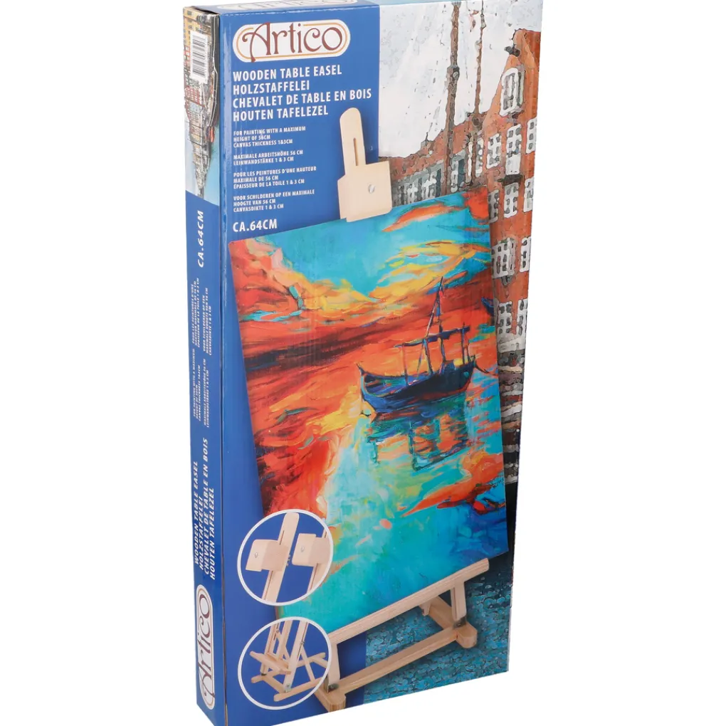 Het fijne aan de Artico tafelezel is niet alleen zijn compacte formaat, maar ook het feit dat hij volledig inklapbaar en in hoogte verstelbaar is. Wanneer je de schildersezel niet gebruik om een canvas op vast te houden kun je hem makkelijk inklappen en opbergen. Daarnaast is de mogelijkheid om de tafelezel in te klappen ook ideaal wanneer je hem mee wil nemen. Naast inklapbaar is deze schildersezel tafelmodel ook in hoogte verstelbaar. Hij houdt canvassen met een maximale hoogte van 56 centimeter en een maximale dikte van 1 of 3 centimeter.