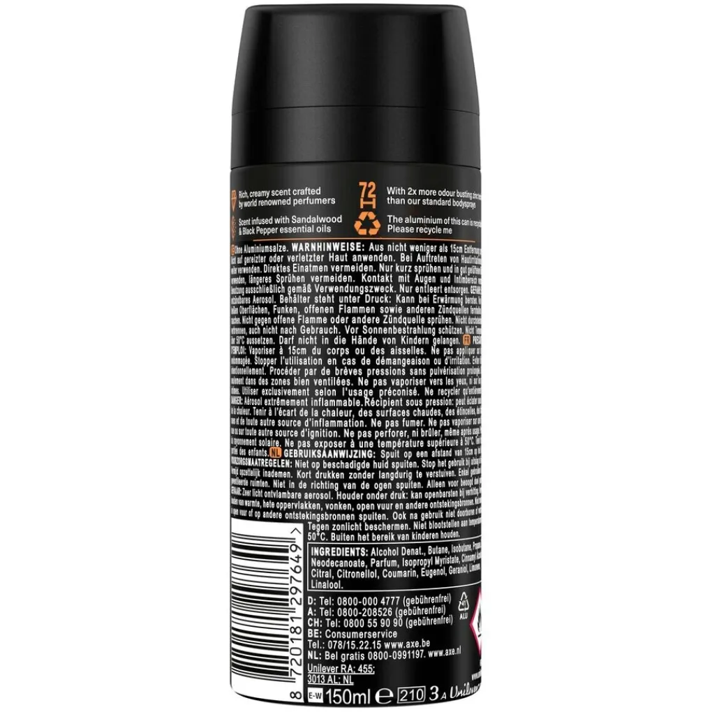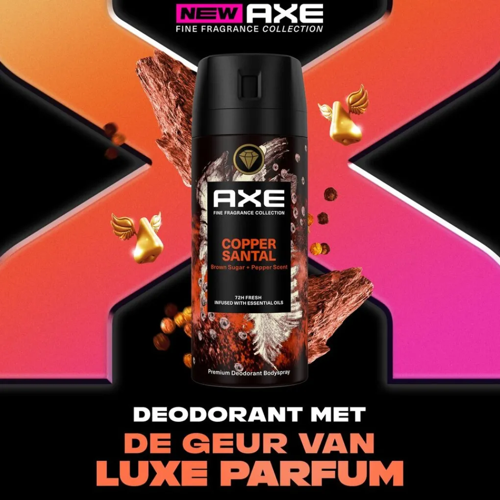 Axe Fine Fragrance Copper Santal Deodorant Bodyspray met de geur van sandelhout, bruine suiker en zwarte peper ruikt als een luxe parfum en beschermt effectief als een deo.