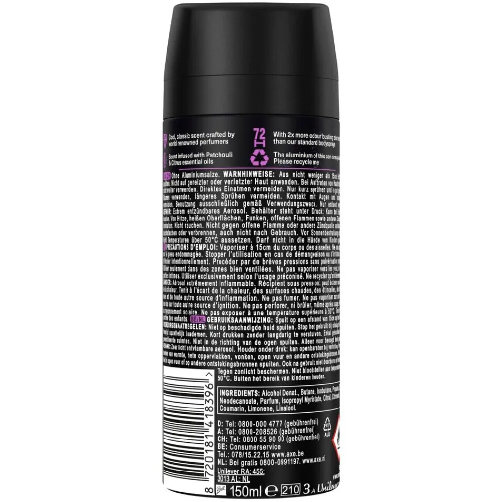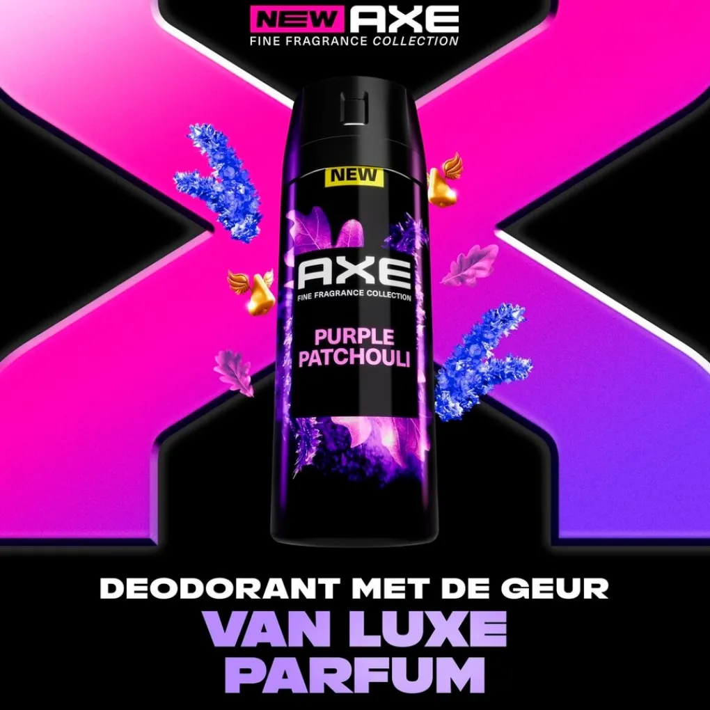 De Axe Fine Fragrance Purple Patchouli Deodorant Bodyspray biedt een unieke combinatie van een luxe geur en langdurige bescherming tegen geurtjes, dankzij de twee keer zo effectieve zinktechnologie.