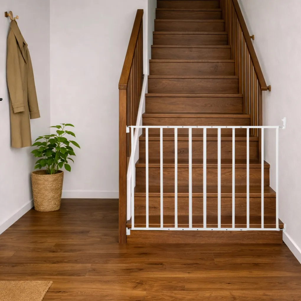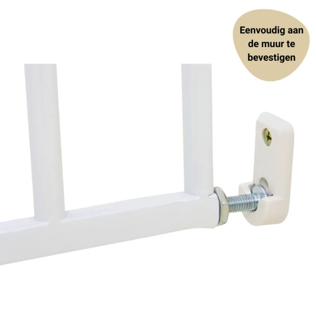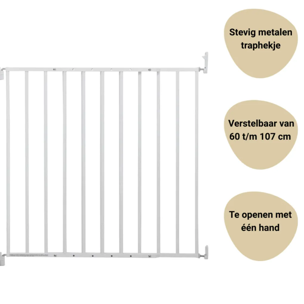 Met dit Powerfix traphekje van Geuther Baaloo is je huis weer een stukje veiliger voor de kleine avonturiers. Het hekje is eenvoudig aan de muur te bevestigen door middel van schroeven. Het hekje past tussen trap-of deuropeningen van 60 t/m 107 cm. De Powerfix van Geuther Baaloo is zowel boven als beneden aan een trap te plaatsen. Het traphek is met één hand te openen, voor als jij je handen vol hebt met spullen of je kindje in je armen hebt. De knoppen kunnen niet door kinderhandjes open gemaakt worden. Het hekje is 72 cm hoog, een veilige hoogte voor kindjes