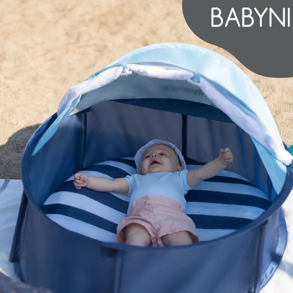 Deze handige speelruimte Babyni is van het merk Babymoov. De Babyni is op verschillende manieren te gebruiken, bijvoorbeeld als strandtentje, zodat je kleintje beschermt is tegen de zon tijdens een dagje strand. Of om te gebruiken als speelruimte, zowel binnen als buiten. De Babyni speelruimte heeft een pop-up systeem en kun je dus op ieder moment heel eenvoudig in- en uitklappen. De Babyni is voorzien van een comfortabel matrasje, zodat je kleintje altijd comfortabel zal liggen. De speelruimte is voorzien van anti UV-bescherming, waardoor je kleintje goed beschermt is tegen de zon tijdens het slapen en spelen. Ook is het voorzien van een inklapbaar luifel en muskietennet, dat alle beestjes buiten houdt. De speelruimte is te reinigen met een vochtige doek en het matrasje is wasbaar met de hand.
