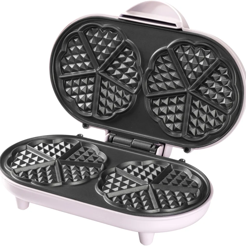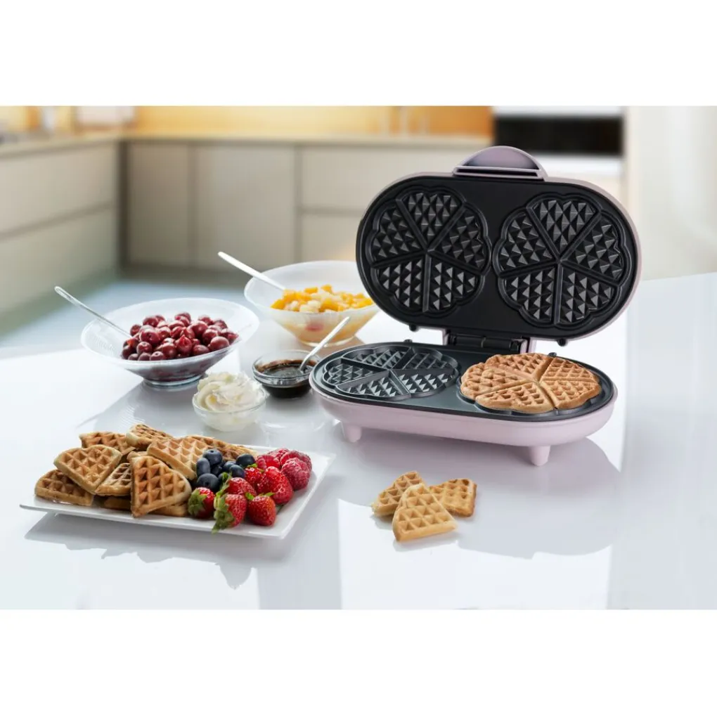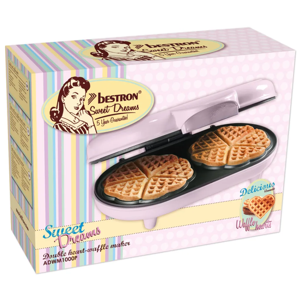 Maak eenvoudig 10 hartvormige wafels met de Bestron Wafelijzer ADWM1000P. Dubbel wafelijzer met antiaanbaklaag en automatische temperatuurregeling.