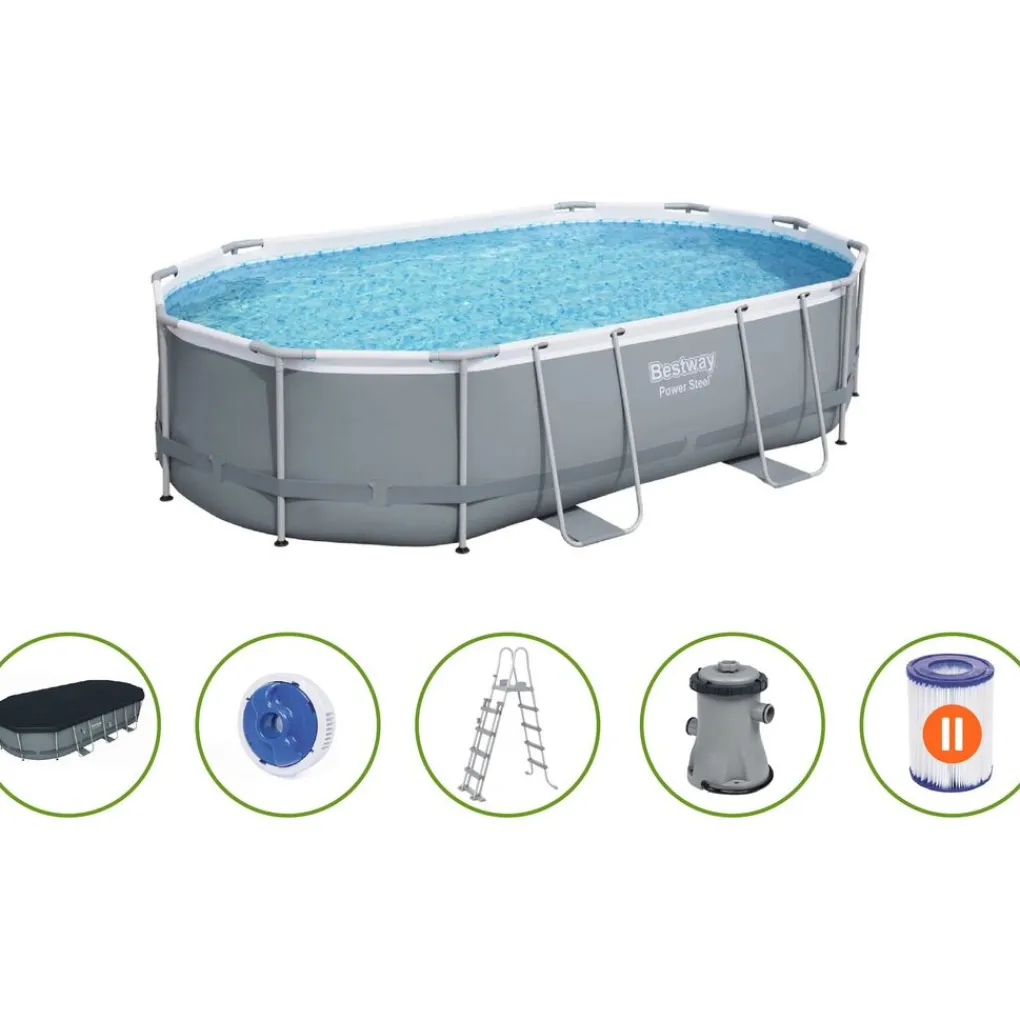 ✅Afmetingen: L488 x B305 x H107 cm✅Vorm: ovaal✅Inhoud: 10.949 L✅Kleur: grijs✅Inclusief patroonfilterpomp met cartridge, ladder, afdekzeil & chloordispenser✅Capaciteit filterpomp: 3.028 L/u✅Cartridge type II✅Met handig leegloopventiel & reparatiepatch✅Stevig & extra stabiel model✅Luxueuze look✅Veilig & duurzaam✅Robuuste drielaagse wand✅Stevige buizenconstructie✅Roestbestendige coating✅Bestand tegen UV-straling & chloor
