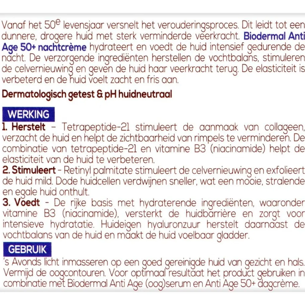Biodermal Anti Age 50+ nachtcrème met hyaluronzuur voedt intensief, stimuleert de celvernieuwing en herstelt de veerkracht van je huid. Aanbevolen leeftijd: vanaf 50 jaar.