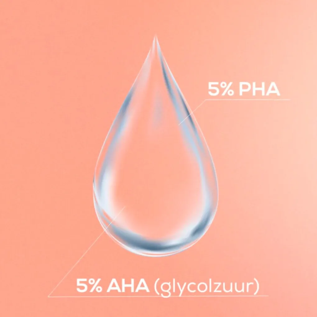 1. Exfolieert – De effectieve combinatie van AHA en PHA exfolieert mild en helpt dode huidcellen te verwijderen voor een zachte huidtextuur en stralende huid2. Stimuleert – AHA met kleine moleculen werkt dieper in de huid om zo de celvernieuwing te stimuleren en de huidteint te helpen verbeteren3. Hydradeert – Betaïne en glycerine hydrateren de huid terwijl panthenol (provitamine B5) de huid kalmeert. Samen beschermen ze de huidbarrière tegen overmatig exfoliëren en dragen ze bij aan een goede vochtbalans van de huid.