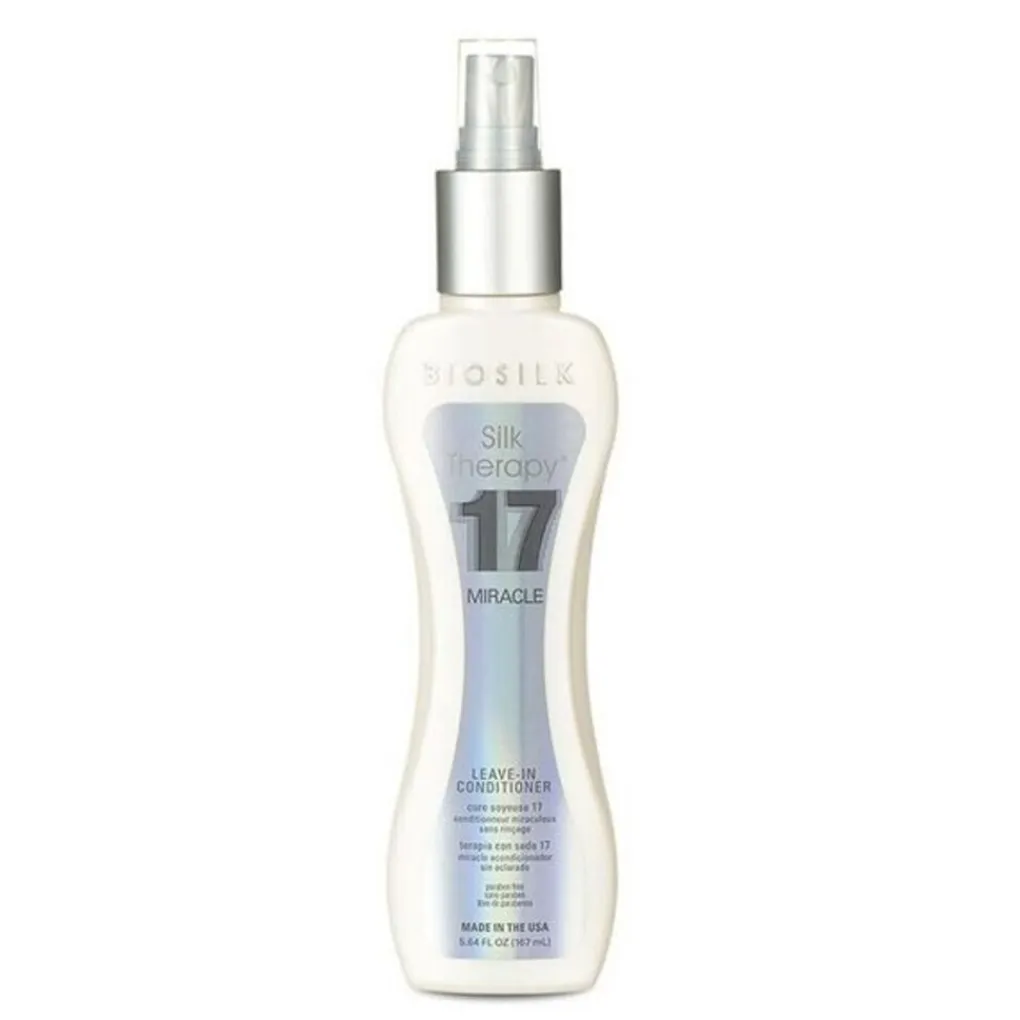 BioSilk Therapy 17 Miracle Leave-in Conditioner is onderdeel van de Silk Therapy System lijn van BioSilk. De BioSilk Silk Therapy System lijn is een assortiment, verrijkt met zijde, van voedende producten voor het haar. Omdat zijde grotendeels uit dezelfde aminozuren bestaat als menselijk haar, is het mogelijk om deze aminozuren diep in het haar achter te laten. De lijn is speciaal ontwikkeld voor normaal tot droog haar. BioSilk Therapy 17 Miracle Leave-in Conditioner, een conditioning spray, hydrateert het haar en hoofdhuid onmiddelijk. Het haar krijgt volume en body en wordt tegelijkertijd gerepareerd. Gespleten punten worden tegengegaan en het haar wordt minder breekbaar. Verkrijgbaar in 150 ml.