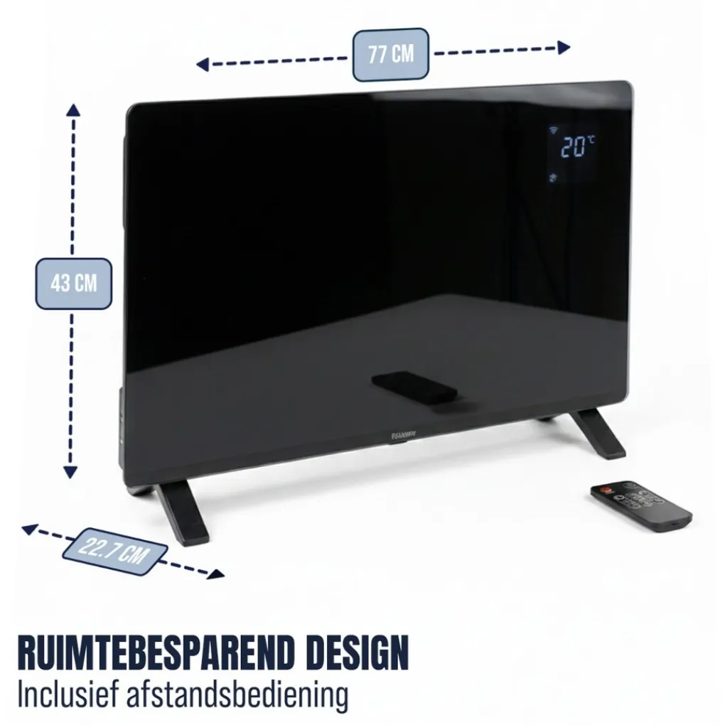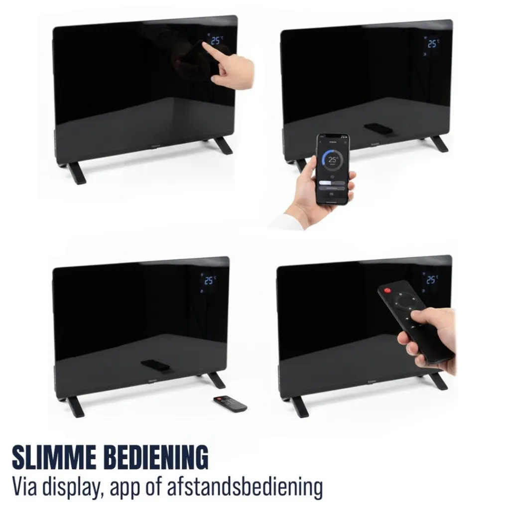 De BluMill Elektrische Kachel is een duurzaam alternatief voor traditionele verwarming en combineert efficiëntie met een modern uiterlijk. Dankzij het compacte formaat en het minimalistische zwarte glas design past de design kachel moeiteloos in elk interieur. De kachel neemt weinig ruimte in beslag en kan zowel vrijstaand op de vloer als aan de muur worden gemonteerd. Alle benodigde onderdelen worden standaard meegeleverd. Bedien je elektrische kachel eenvoudig met de app, ingebouwde LCD touchscreen of meegeleverde afstandsbediening! De ingebouwde thermostaat zorgt ervoor dat de kachel automatisch stopt met verwarmen zodra de ingestelde temperatuur is bereikt, wat zorgt voor een constant comfort en efficiënt energiegebruik.