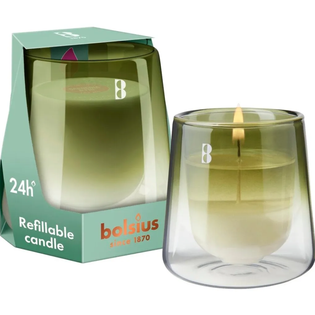 De Bolsius Cleanlight Gardenia & Fig Starterkit bevat een handgeblazen glazen houder en de navulbare geurkaars ‘Gardenia & Fig’.