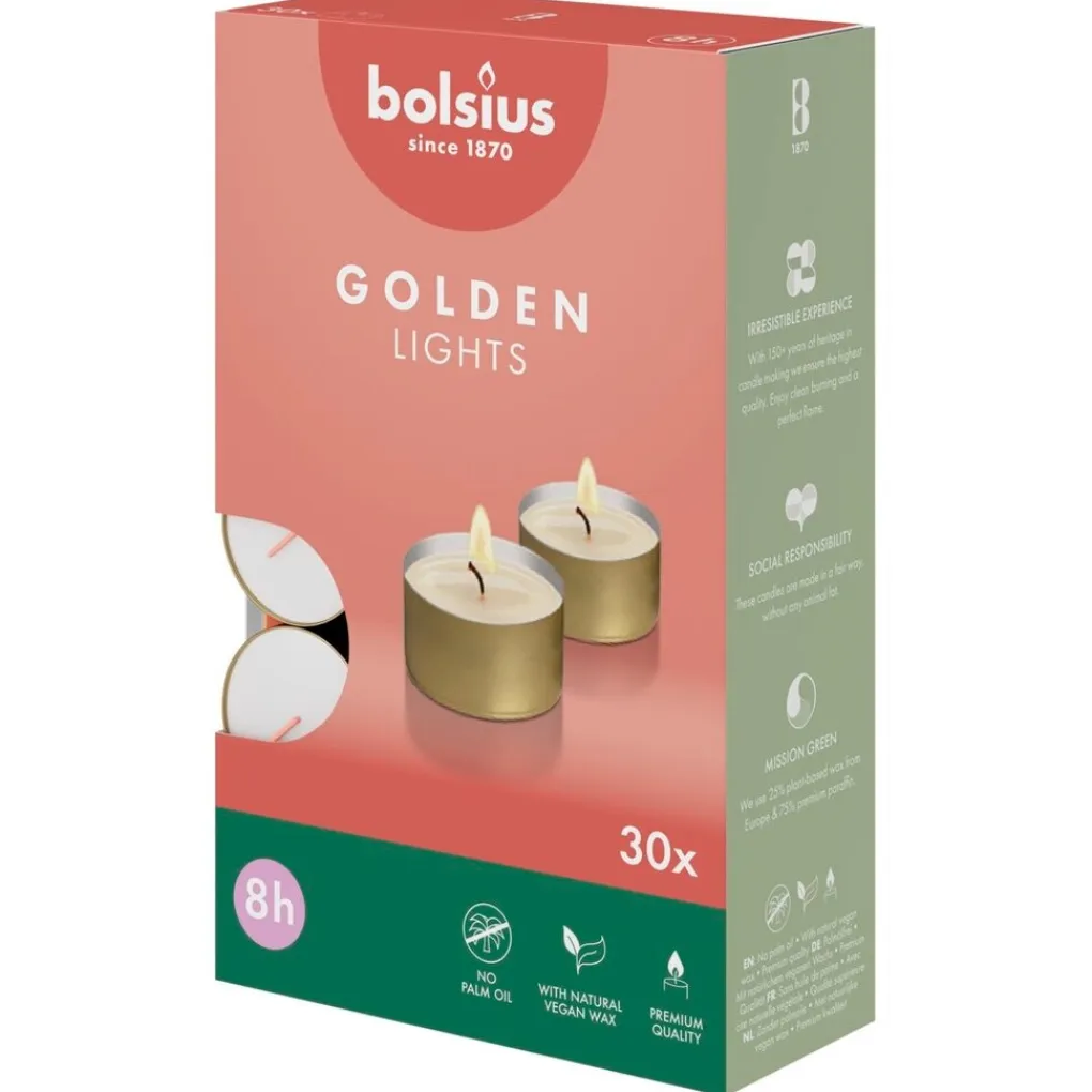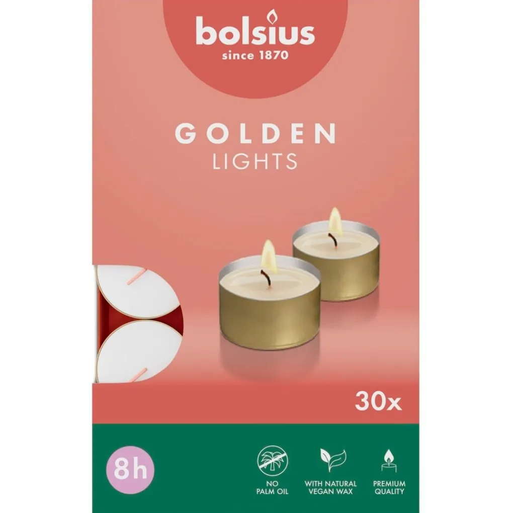 Bolsius – waxinelichtjes met gouden cup – in doos – 8 branduren – 30 stuks