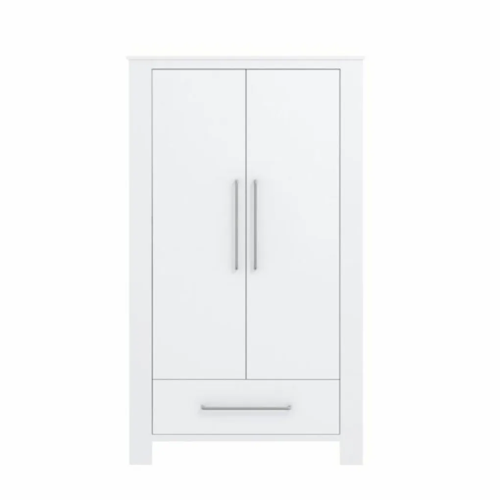 In de kledingkast kunnen alle babykleertjes netjes en overzichtelijk worden opgeborgen. De kast heeft twee deuren en een opberglade. Achter de kastdeuren bevindt zich een hang- en leggedeelte. Met de grote zilverkleurige handgrepen kunnen de kastdeuren en de lade worden geopend. Dit detail komt ook terug in het baby bedje en daardoor passen de meubels perfect bij elkaar.