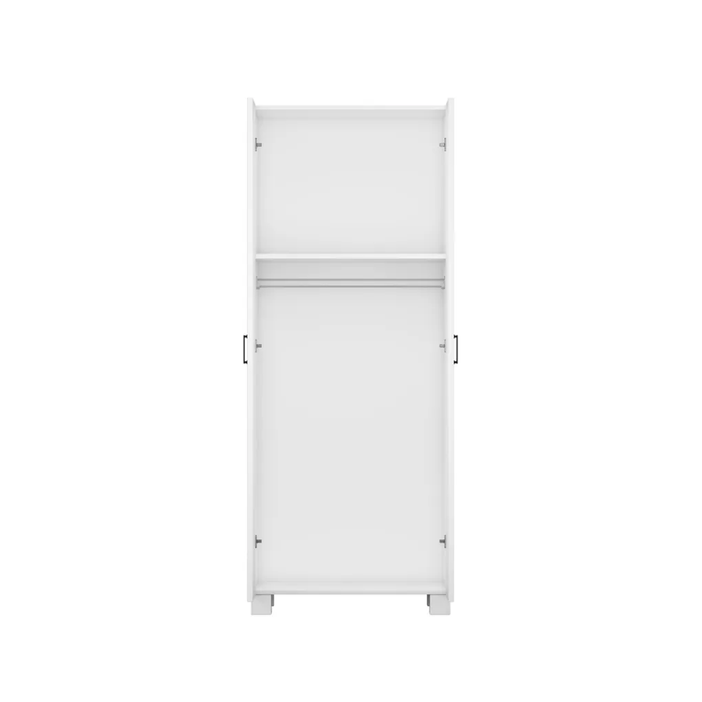 Achter de twee kastdeuren bevindt zich een hangroede en een legplank. Zo kunnen alle kleertjes netjes worden opgehangen en kan je ook nog wat spulletjes neerleggen. De zwarte handgrepen geven de kast een stoer detail.