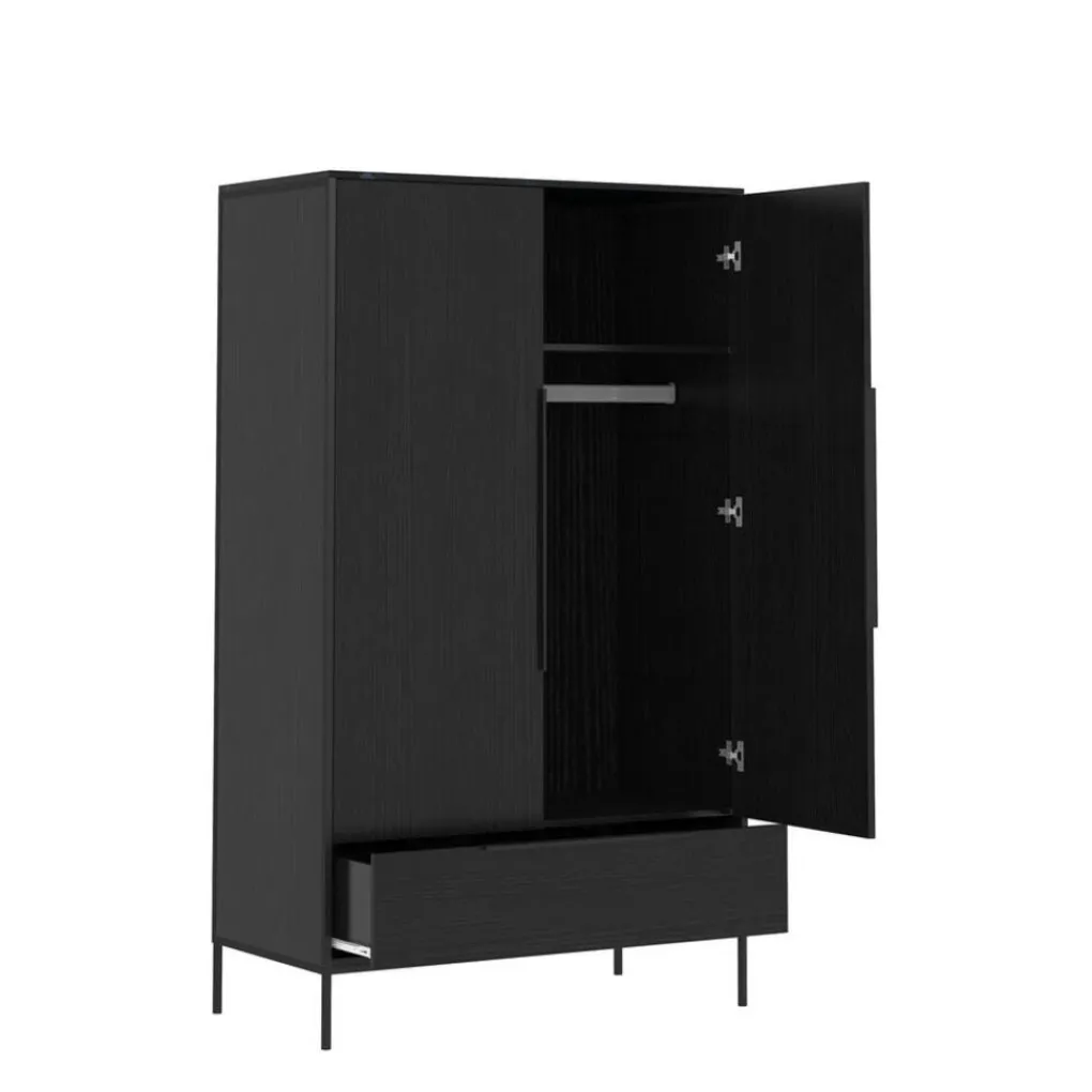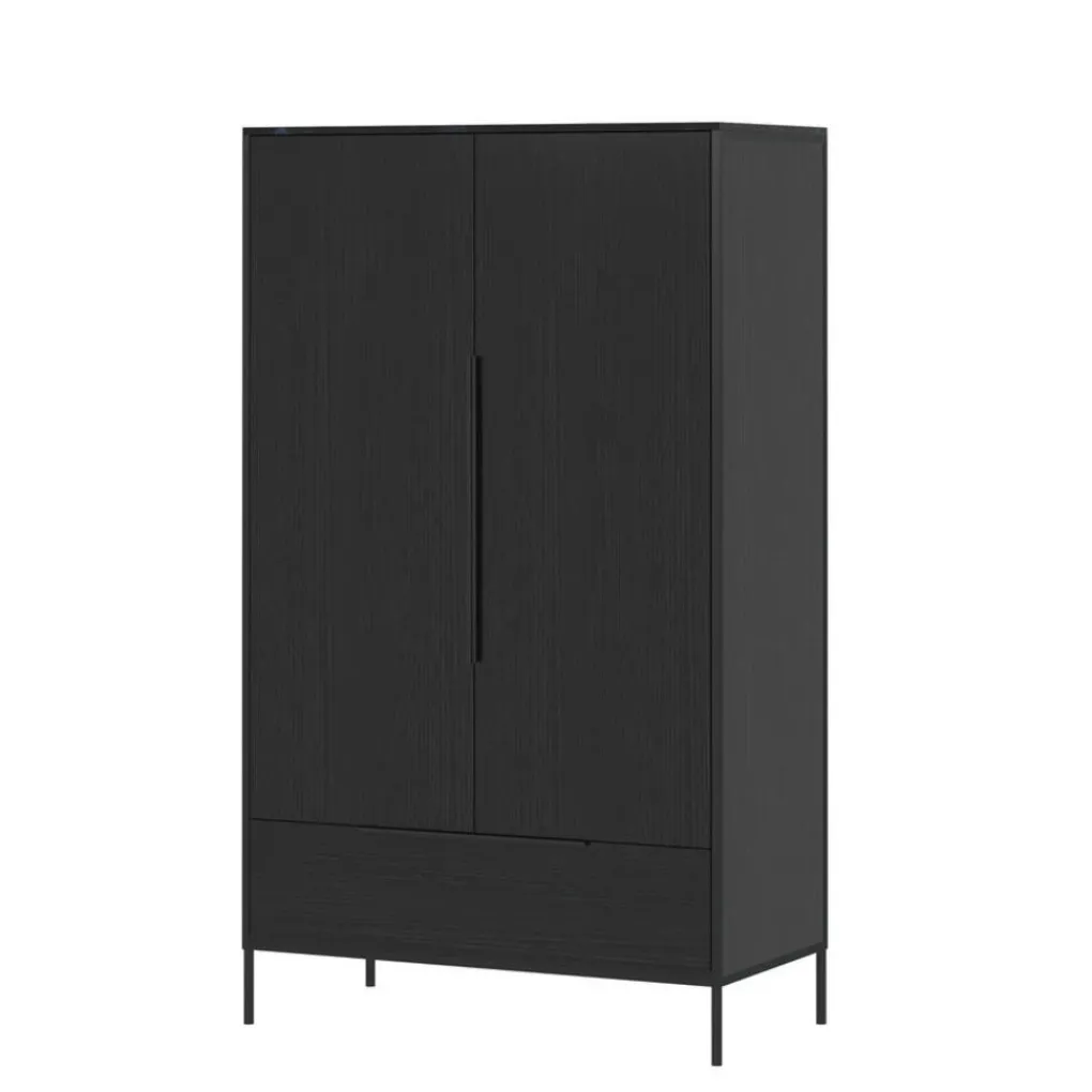 De stoere kast staat op hoge zwarte metalen pootjes, waardoor hij extra ruimtelijk oogt. De handgreepjes van de kastdeuren zijn ook gemaakt van zwart metaal. Achter de rechter kastdeur bevindt zich een ruim hanggedeelte en een legplank bovenin. Achter de linker kastdeur bevinden zich meerdere legplanken. Voor nog meer opbergruimte heeft de kledingkast onderin een ruime lade. De kledingkast is gemaakt van folie overtrokken MDF.