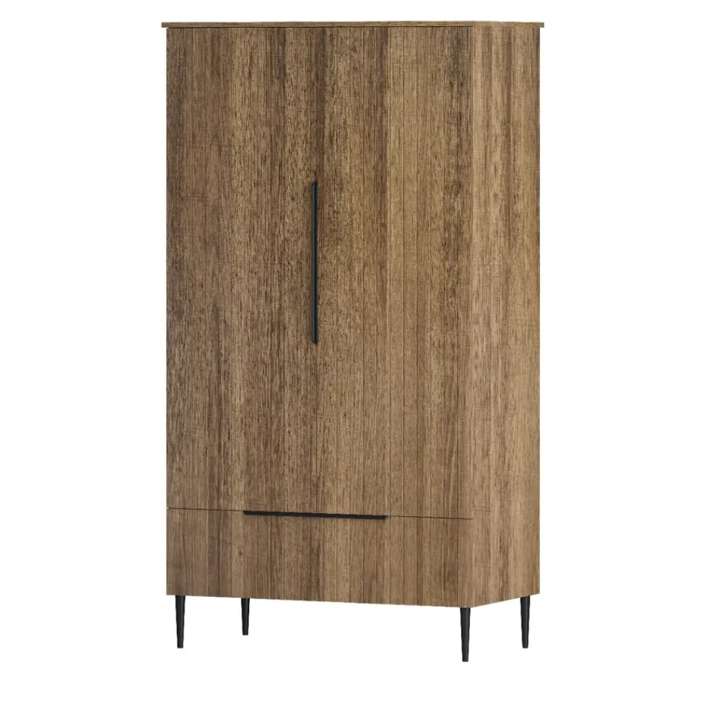 De natuurlijke uitstraling van de kledingkast wordt versterkt door de fronten met een stijlvol reliëfpatroon. De zwarte handgrepen en pootjes voegen een stoer detail toe, wat de kast een modern en trendy uiterlijk geeft. De tijdloze uitstraling en neutrale kleuren maken het gemakkelijk om de kast te combineren met verschillende stijlen en thema’s in de babykamer.