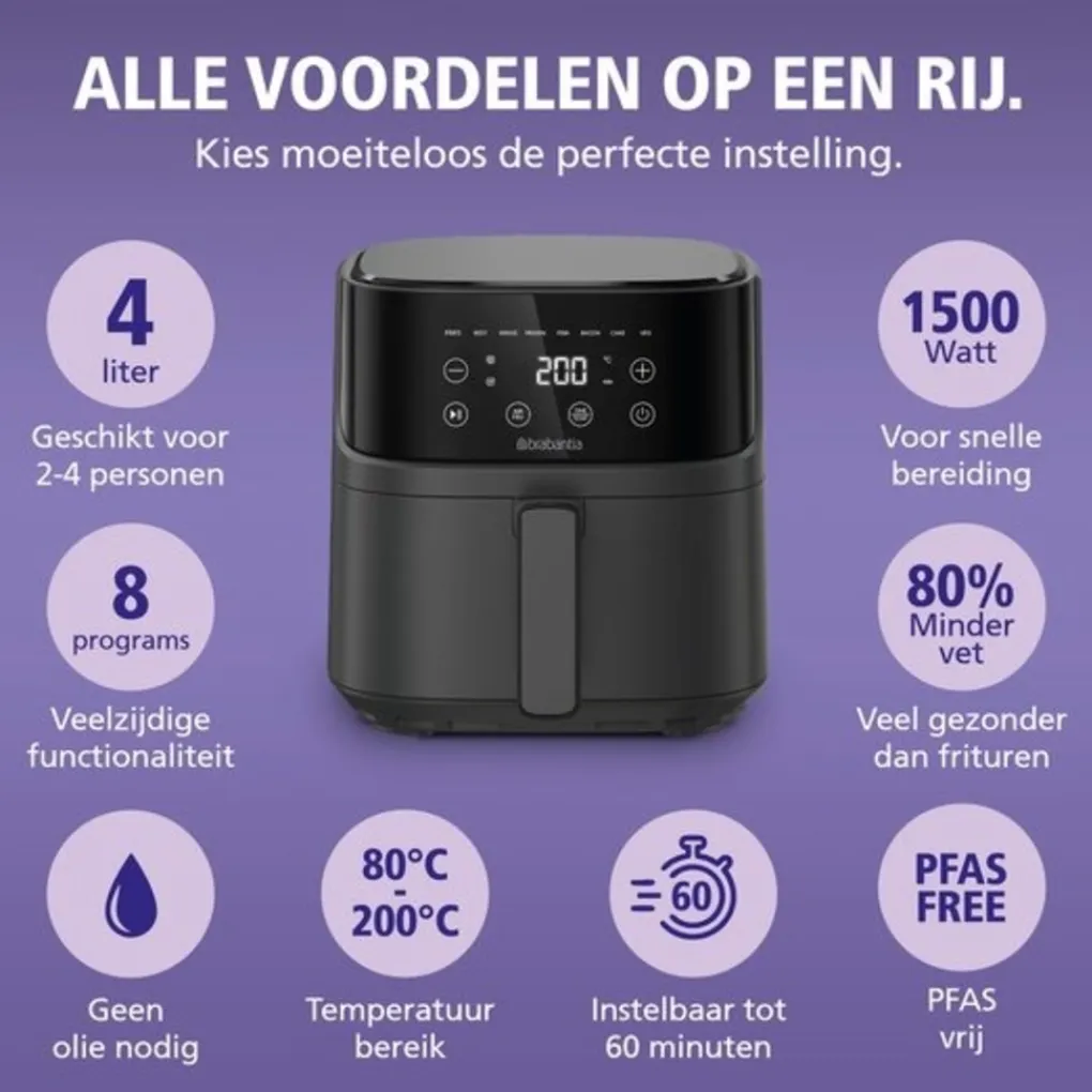 Met een inhoud van 4 liter heeft de Brabantia Airfryer voldoende capaciteit voor 2 tot 4 porties tegelijk – ideaal voor gezinnen of een gezellig etentje. De uitneembare frituurmand met antiaanbaklaag voorkomt dat voedsel blijft plakken en is bovendien vaatwasmachinebestendig, wat schoonmaken extra makkelijk maakt.