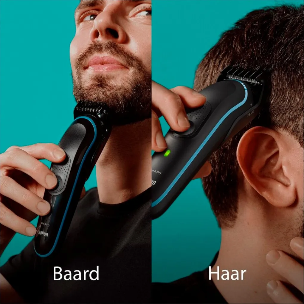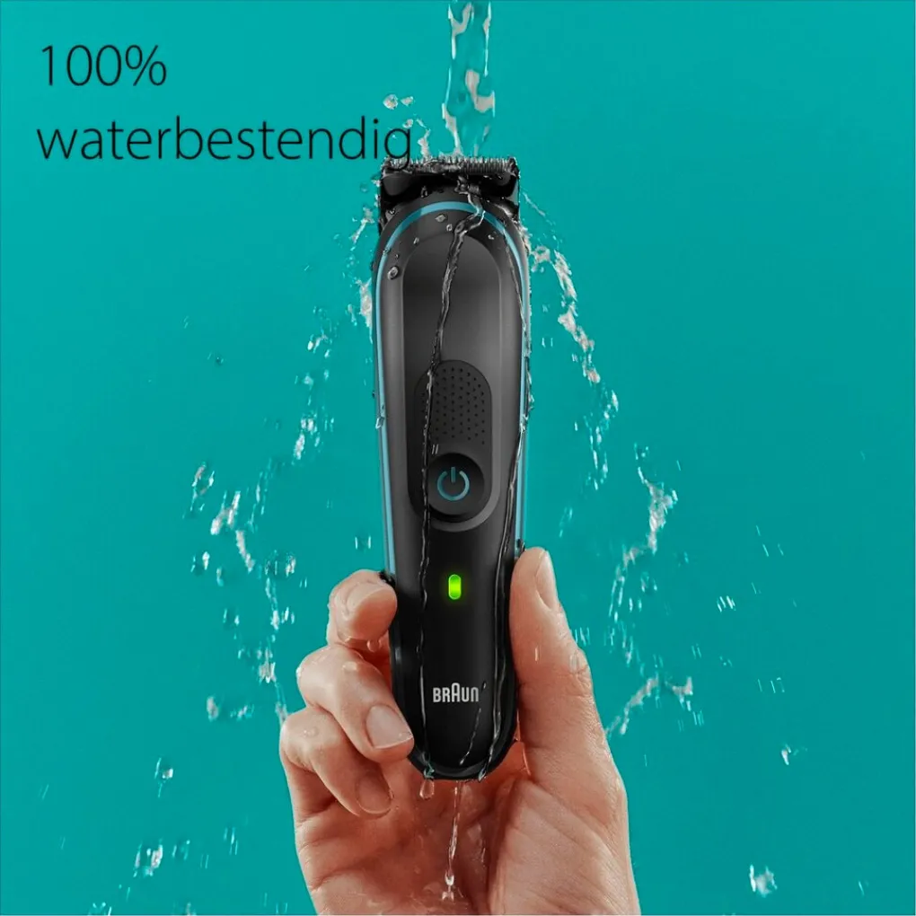 Style en trim jezelf van top tot teen met de Braun Series 5 MGK5411 All-In-One Multigroomkit. De 9-in-1 verzorgingsset met ultrascherpe scheerbladen en kam voor de gevoelige zone heeft een gebruiksduur van 100 minuten.