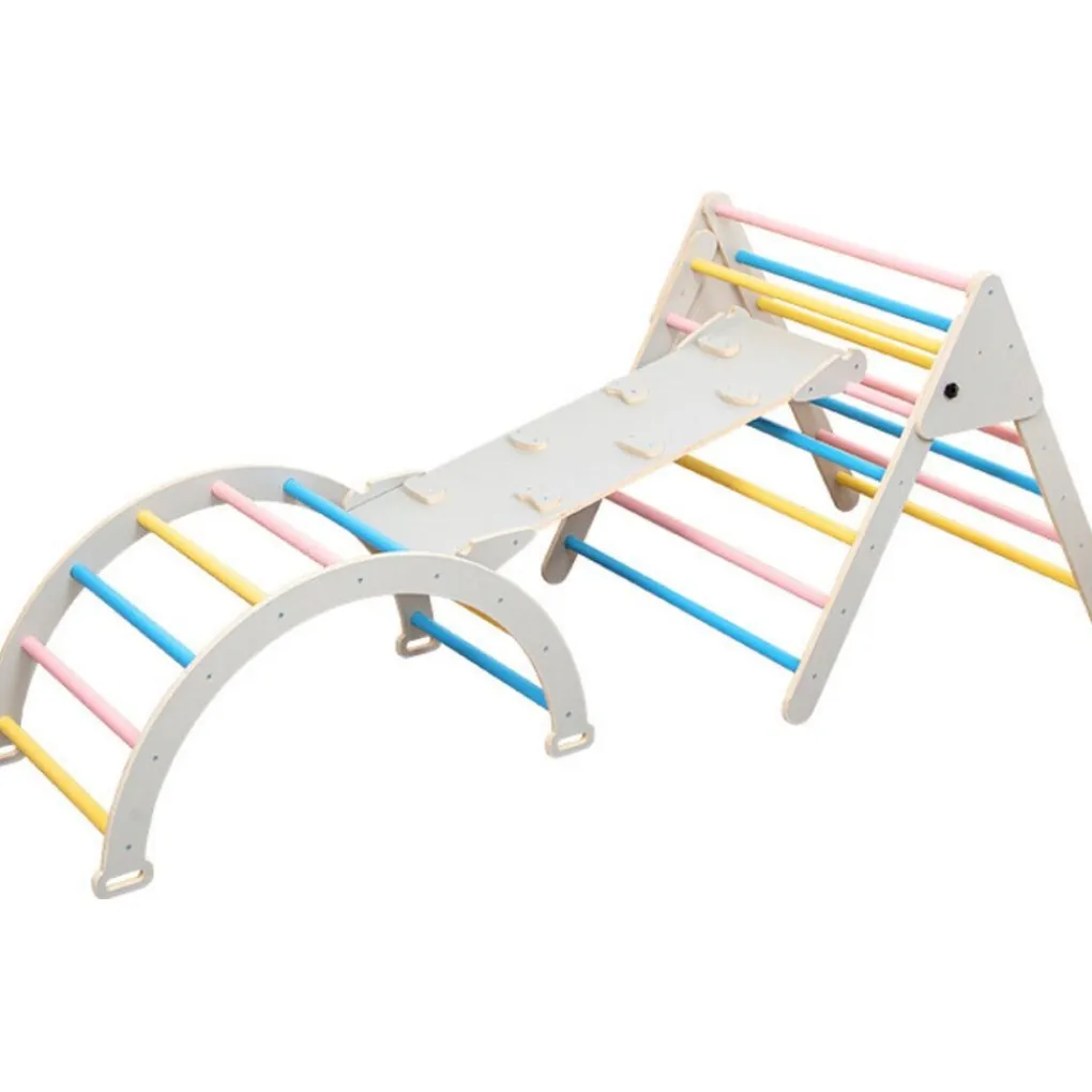 Maak kennis met de Buxibo Opvouwbare Driehoek + Klimboog + Helling, een veelzijdig stuk Montessori meubels houten speelgym dat binnen plezier en avontuur biedt voor kinderen. Dit speelgoed combineert een klimrek, glijbaan en klimboog, waardoor het perfect is voor actief spelen en ontdekken.