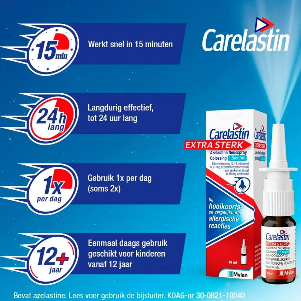 Carelastin Extra Sterk Neusspray is een product dat je gebruikt als je last hebt van de symptomen van hooikoorts, huisstofmijtallergie of huisdierenallergie. Carelastin bevat azelastine (een antihistamine) en werkt binnen 15 minuten.