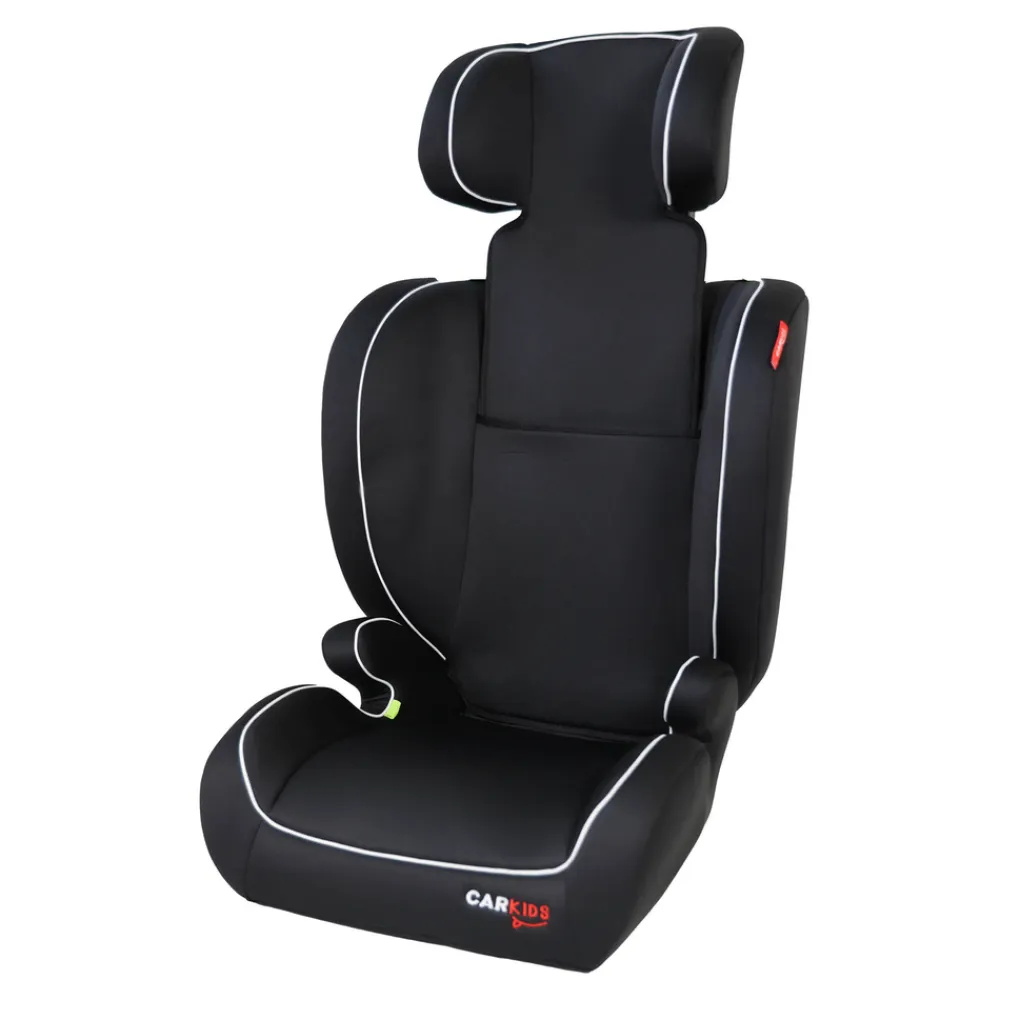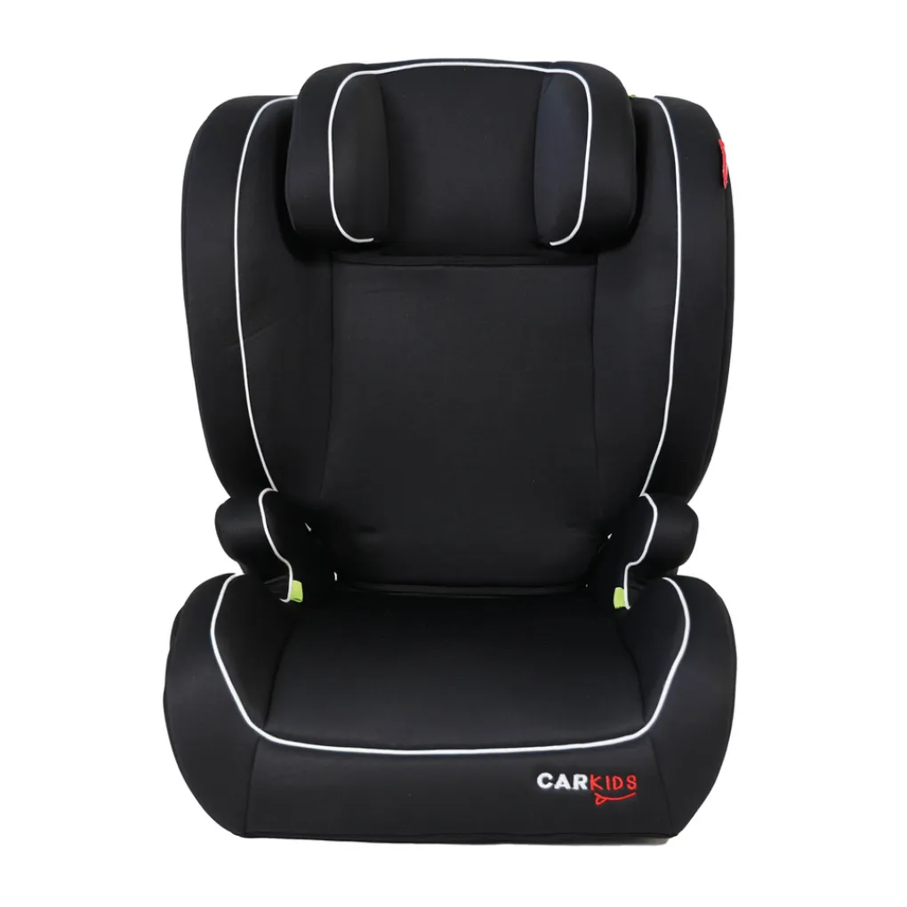 Carkids Frankie I-Size zwart autostoeltje met witte accenten, voor kinderen met een lengte van 100-150cm. Kan geïnstalleerd worden op de passagiersstoel of op de achterbank. Kan als kinderzitje of als zitverhoger gebruikt worden, met in hoogte verstelbare hoofdsteun. Voldoet aan R-129 norm, vervanger van de R44/04 goedkeuring. Door de R-129 norm zijn de zitverhogers/kinderzitjes niet meer ingedeeld in een groep maar op lengte van een kind.