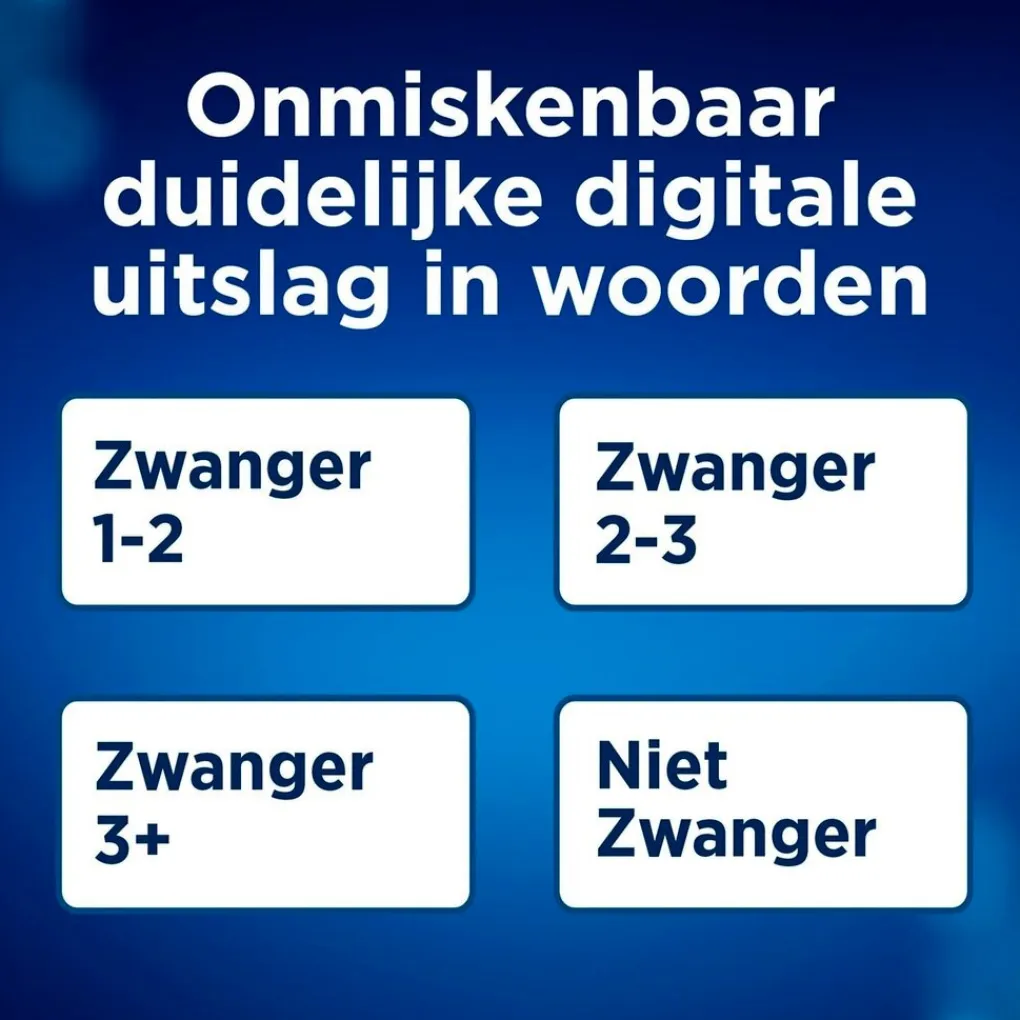 Lees altijd eerst de bijsluiter van uw medicijnen voordat u een test uitvoert.Een onterechte positieve uitslag kan worden veroorzaakt door medicatie die hCG bevat en door bepaalde zeldzame medische aandoeningen.Een buitenbaarmoederlijke of recente zwangerschap (zelfs als de zwangerschap niet is voldragen) kan misleidende uitslagen opleveren.Als u (bijna) in de menopauze bent, kan u ook een onterechte uitslag ‘Zwanger’ krijgen terwijl u niet zwanger bent.De test zou NIET moeten worden beïnvloed door hormoonbehandelingen met clomifeencitraat, reguliere pijnstillers, alcohol, antibiotica of de anticonceptiepil. Als u een onverwachte uitslag krijgt, dient u deze te bespreken met uw huisarts.Bij meerlingzwangerschappen en buitenbaarmoederlijke zwangerschappen kan de wekenindicator een verkeerde uitslag geven.Dit digitale IVD-apparaat voldoet aan de vereisten voor emissie en immuniteit van EN 61326-2-6. De EMC-tegenmaatregelen die in dit elektronische instrument zijn gebruikt, geven een redelijke bescherming tegen de effecten van elektromagnetische interferentie die vaak in de thuisomgeving voorkomt. De volgende preventieve waarschuwingen zijn van toepassing op apparatuur die voldoet aan EN 61326-2-6. a) Gebruik van dit instrument in een droge omgeving, vooral als er synthetische materialen aanwezig zijn (synthetische kleding, tapijten enz.) kan schadelijke statische ontladingen veroorzaken die foutieve resultaten kunnen veroorzaken. b) Gebruik dit instrument niet in de nabijheid van bronnen van sterke elektromagnetische straling (bijv. mobiele telefoons), omdat deze de juiste werking kunnen verstoren.Dit is een medisch hulpmiddel. Lees aandachtig de instructies voor gebruik. SPD Swiss Precision Diagnostics GmbH, Route de St Georges 47, 1213 Petit-Lancy, Genève, Zwitserland. 0800 394 9031. www.clearblue.com. Naam en adres van de geautoriseerde vertegenwoordiger: MDSS GmbH, Schiffgraben 41 Hannover 30175, Duitsland: [email protected].