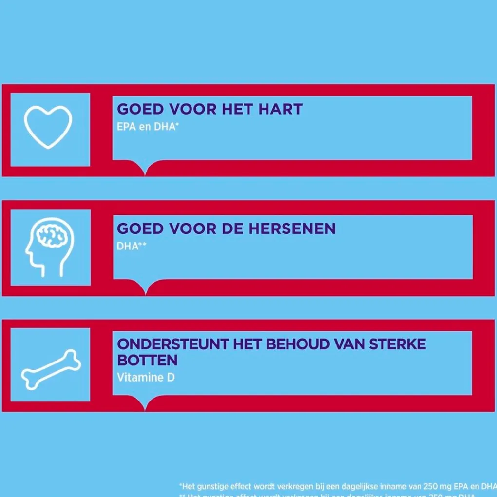 Goed voor het hart¹: EPA en DHA hebben een gunstige invloed op de normale werking van het hart. Het gunstige effect wordt verkregen bij een dagelijkse inname van 250 mg EPA en DHA. Goed voor de hersenen²: DHA is een belangrijke bouwsteen voor de hersenen. Het gunstige effect wordt verkregen bij een dagelijkse inname van 250 mg DHA. Ondersteunt het behoud van sterke botten³: Vitamine D draagt bij aan de instandhouding van sterke botten.