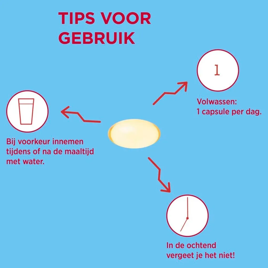 Gebruiksaanwijzing en aanbevolen gebruik per dag: Volwassenen: 1 capsule per dag. Bij voorkeur innemen tijdens of na de maaltijd met water. De aanbevolen dagelijkse dosering niet overschrijden. De Gezondheidsraad adviseert ouderen om dagelijks de volgende hoeveelheid extra vitamine D in te nemen: vrouwen vanaf 50 jaar: 10 μg. Voor mensen die weinig buiten komen of mensen met een donkere huid: vrouwen en mannen tot 70 jaar: 10 μg. Vrouwen en mannen vanaf 70 jaar: 20 μg. Dit voedingssupplement is niet geschikt voor gebruik door kinderen jonger dan 18 jaar.