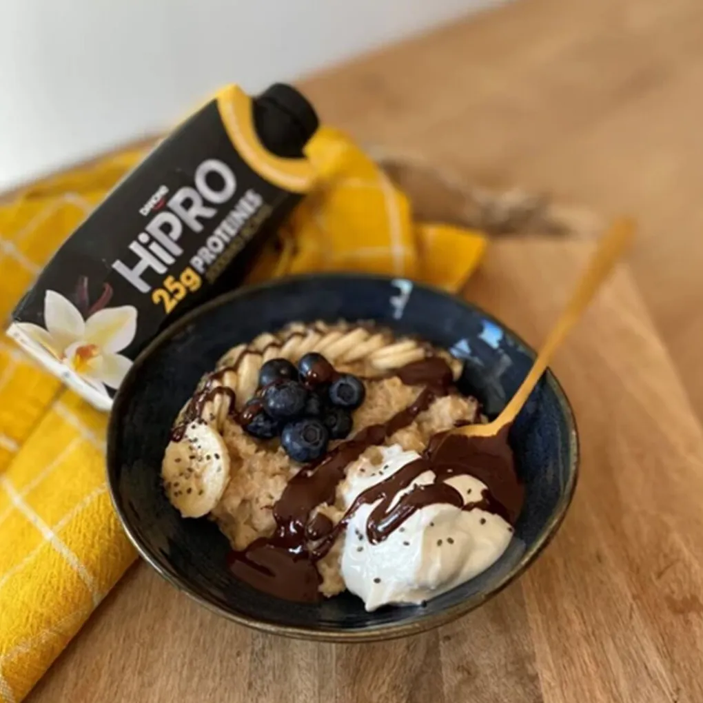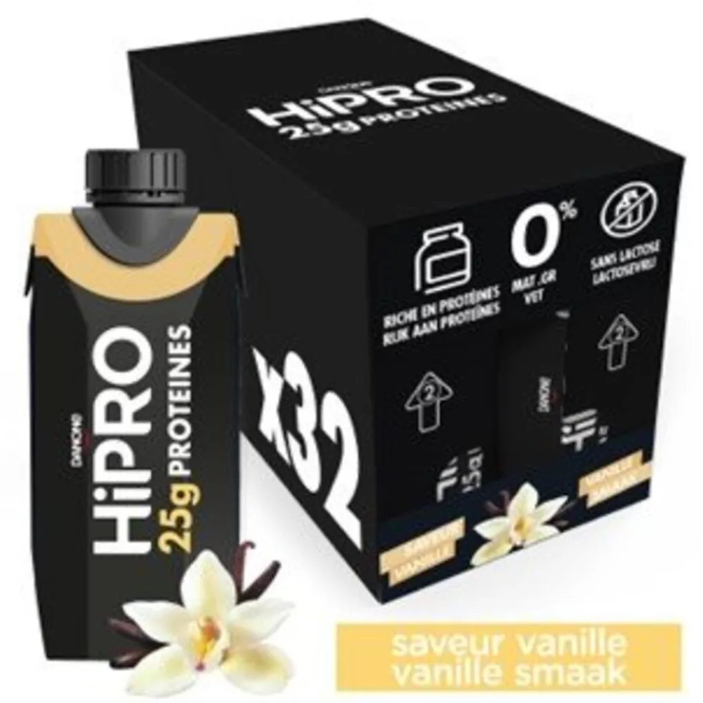 Danone HiPRO Protein Drink – Chocoladesmaak en Vanillesmaak, de perfecte keuze voor iedereen die op zoek is naar heerlijke proteïnedranken. Danone HiPro Protein Drink staat symbool voor deze voortdurende toewijding en brengt je proteïnedranken van hoge kwaliteit in heerlijke chocolade- en vanillesmaken. Of je nu van chocolade of vanille houdt, er is een smaak die bij je past. Beide smaken zijn verkrijgbaar in handige verpakkingen van 330 ml. Bovendien zijn beide smaken ook afzonderlijk verkrijgbaar zodat je van je favoriete smaak kunt genieten zonder steeds aparte flesjes te moeten kopen. Je kunt kiezen uit verpakkingen van 8, 16 of 24 brikjes, afhankelijk van je behoeften en voorraadniveaus. Met deze optie kun je gemakkelijk je voorraad eiwitshakes aanvullen en genieten van het gemak en de voordelen van Danone HiPro Protein Drink. Elke portie Danone HiPro Protein Drink bevat 25g proteïne, met alle 9 essentiële aminozuren en 5000mg BCAA’s, wat ideaal is voor fitnessliefhebbers en atleten. Het is ook vetarm, suikerarm en lactosevrij, waardoor het ideaal is voor mensen met verschillende dieetbehoeften. Kies voor de Danone HiPro proteïnedrank en geniet van de heerlijke smaken, de handige verpakking en de mogelijkheid om in bulk te kopen. Belangrijkste kenmerken van Danone HiPRO • 25 g eiwit per portie • 5000 mg BCAA • 9 essentiële aminozuren • 0% vet • Zonder lactose Gebruik HiPRO ambient to drink kan buiten de koelkast worden bewaard (en desgewenst in de koelkast) en begeleidt je bij al je sportieve avonturen! HiPRO ambient to drink kan buiten de koelkast worden bewaard (en desgewenst in de koelkast) en begeleidt je bij al je sportieve avonturen!