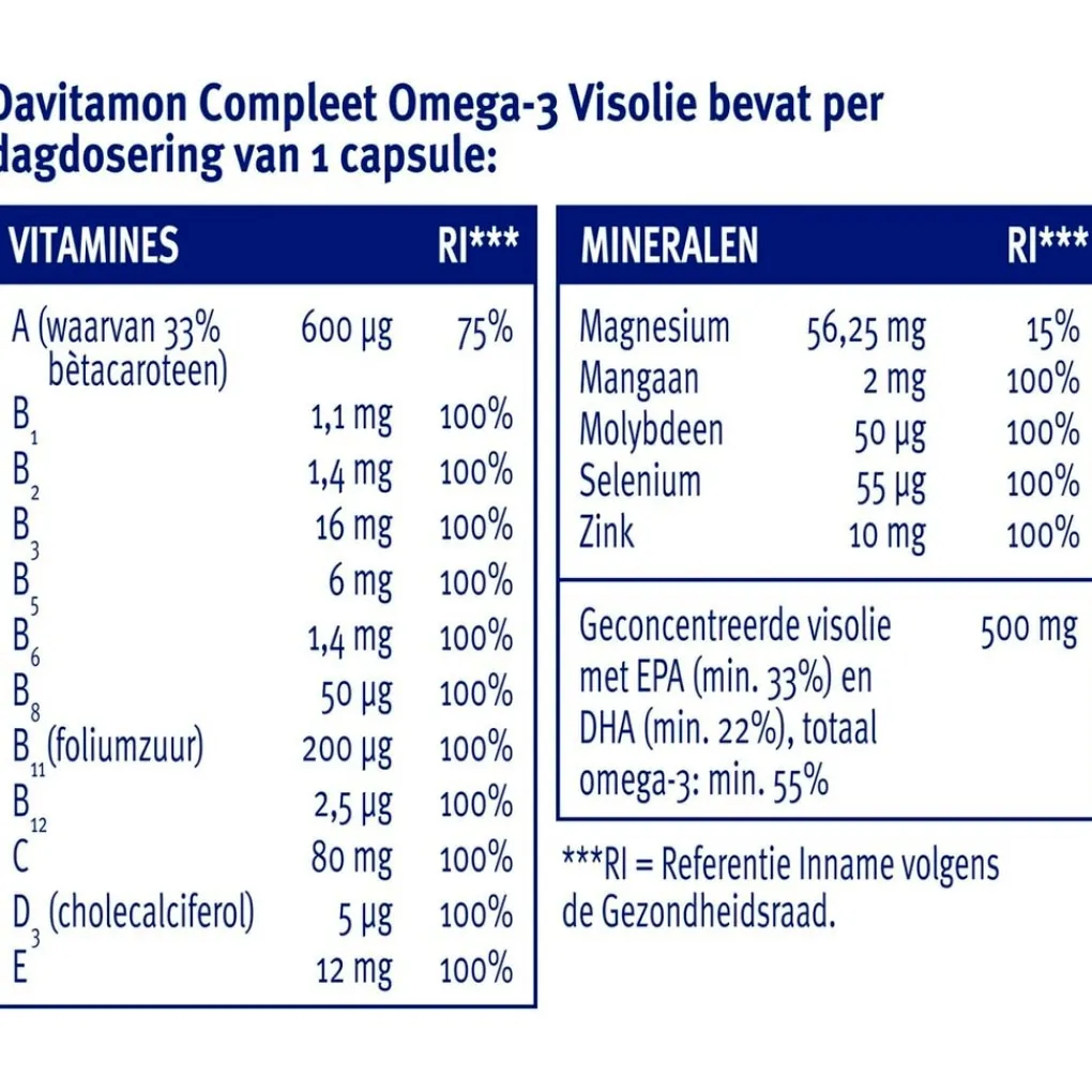 Samenstelling:# Davitamon Compleet Omega-3 Visolie bevat per dagdosering van 1 capsule:# Vitamines;RI***# A (waarvan 33% bètacaroteen);600;µg;75%# B1;1,1;mg;100%# B2;1,4;mg;100%# B3;16;mg;100%# B5;6;mg;100%# B6;1,4;mg;100%# B8;50;µg;100%# B11 (foliumzuur);200;µg;100%# B12;2,5;µg;100%# C;80;mg;100%# D3 (cholecalciferol);5;µg;100%# E;12;mg;100%#Mineralen;RI***#magnesium;56,25;mg;15%#mangaan;2;mg;100%#molybdeen;50;µg;100%#selenium;55;µg;100%#zink;10;mg;100%#geconcentreerde visolie met EPA (min. 33%) en DHA (min. 22%), totaal omega-3: min. 55% 500;mg#