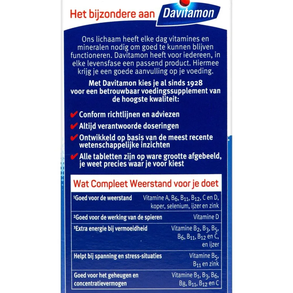 Samenstelling:#Davitamon Compleet Weerstand bevat per dagdosering van 1 tot 3 kauwtabletten:#Vitamines; RI*#A;266,7-800;µg;33-100%#B1;06-1,7;mg;50-150%#B2;0,7-2,1;mg;50-150%#B3;8-24;mg;50-150%#B5;3-9;mg;50-150%#B6;0,7-2,1;mg;50-150%#B8;25-75;µg;50-150%#B11 (foliumzuur);100-300;µg;50-150%#B12;1,3-3,8;µg;50-150%#C;40-120;mg;50-150%#D3 (cholecalciferol);1,7-5;µg;33-100%#E;6-18;mg;50-150%#Mineralen;RI*#calcium;40-120;mg;5-15%#chroom;20-60;µg;50-150%#jodium;50-150;µg;33-100%#koper;0,5-1,5;mg;50-150%#magnesium;18,8-56,3;mg;5-15%#mangaan;1-3;mg;50-150%#molybdeen;25-75;µg;50-150%#selenium;27,5-82,5;µg;50-150%#ijzer;7-21;mg;50-150%#zink;3,3-10;mg; 33-100%#