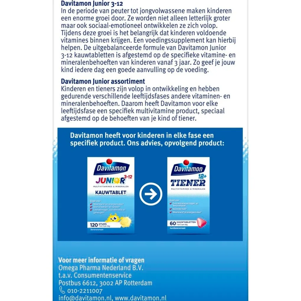 Om goed te kunnen blijven functioneren heeft ons lichaam elke dag vitaminen en mineralen nodig. Daarom heeft Davitamon voor iedereen, in elke levensfase, een ander product. Zo krijg je de juiste aanvulling op je voeding. Davitamon biedt al sinds 1928 betrouwbare voedingssupplementen aan van de hoogste kwaliteit.