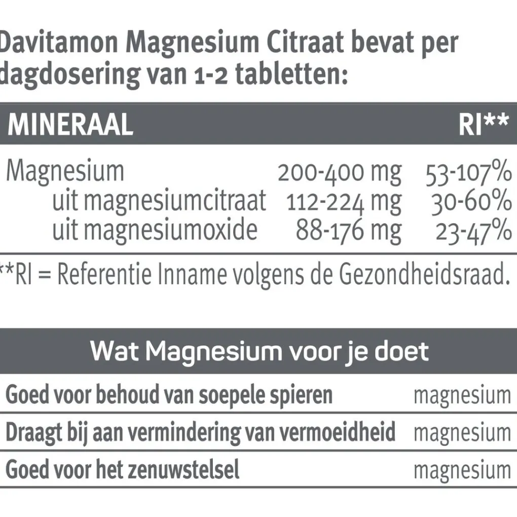 Samenstelling:# Davitamon Magnesium Citraat bevat per dagdosering van 1-2 tabletten:# Mineraal;RI**#magnesium;200-400;mg;53-107%#uit magnesiumcitraat;112-224;mg;30-60%#uit magnesiumoxide;88-176;mg;23-47%#