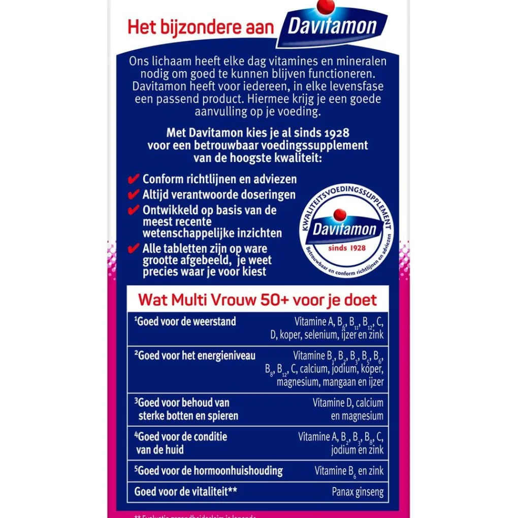 Samenstelling:#Davitamon Multi Vrouw 50+ bevat per dagdosering van 1 tablet:#Vitamines;RI*#A (waarvan 50% bètacaroteen);800;µg;100%#B1;1,65;mg;150%#B2;2,1;mg;150%#B3;16;mg;100%#B5;6;mg;100%#B6;2,1;mg;150%#B8;75;µg;150%#B11 (foliumzuur);300;µg;150%#B12;5;µg;200%#C;120;mg;150%#D3 (cholecalciferol);10;µg;200%#E;18;mg;150%#Mineralen; RI*#calcium;160;mg;20%#chroom;40;µg;100%#jodium;60;µg;40%#koper;1;mg;100%#magnesium;75;mg;20%#mangaan;2;mg;100%#molybdeen;100;µg;200%#selenium;55;µg;100%#ijzer;14;mg;100%#zink;10;mg;100%#panax ginsengextract;100;mg#