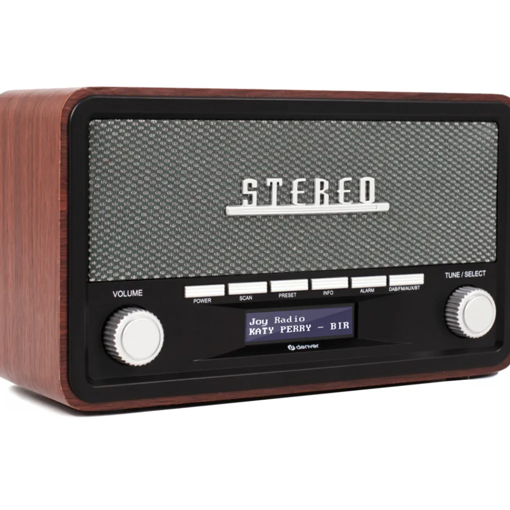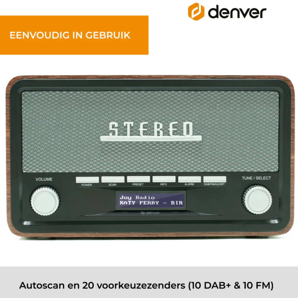 De Denver DAB18 is een compacte DAB radio in trendy retro design met moderne afspeeltechnieken. Hiermee kun je favoriete radioprogramma’s via stereo FM of DAB+ afluisteren en tevoren instellen. De digitale DAB+ tuner ontvangt signalen met een helder en ruisvrij resultaat. Daarnaast kun je draadloos via Bluetooth vanaf een smartphone of tablet je favoriete muziek beluisteren. Via de AUX ingang aan de achterkant kun je verder een MP3 speler aansluiten. Deze retro radio beschikt over 2 stereo speakers en is gestoken in een vintage behuizing hout. De voorkant is uitgevoerd in zwart en grijs met de letters STEREO in retrostijl. Daaronder vind je 2 knoppen voor volume en programmakeuze en 6 toetsen, waaronder een aan/uitknop en een dubbel alarm met snooze functie. Ook is deze retro radio voorzien van 20 voorkeurszenders! De dimbare LCD display op de voorkant geeft via een RDS tuner de naam en soort van het radioprogramma aan. Aan de achterkant vind je een antenne, een batterijenopslag voor batterijen en een kabelingang met AC aansluiting voor netstroom!