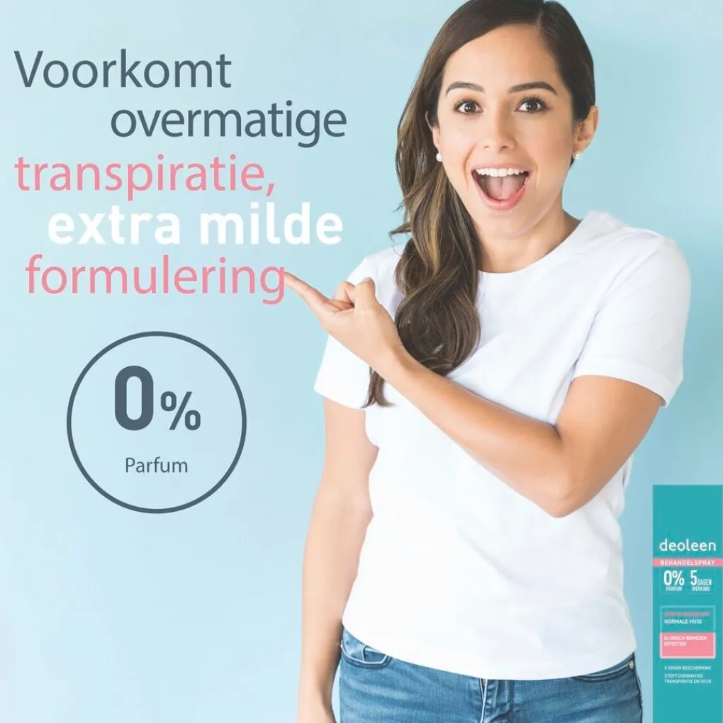 Deoleen Antitranspirant Behandelspray beschermt vijf dagen lang op milde wijze tegen overmatige transpiratie. De parfumvrije spray stopt overmatige transpiratie en geur en is klinisch bewezen effectief.