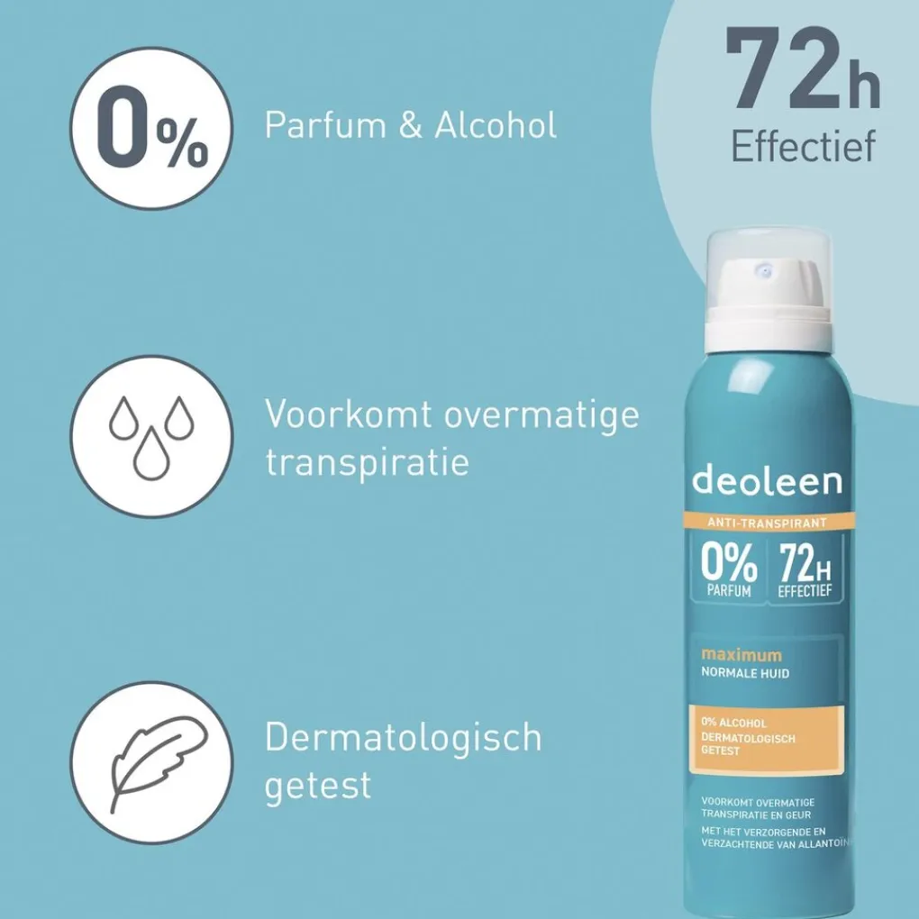 De Deoleen Intense Protect Antitranspirant Spray is speciaal samengesteld om effectief en op milde wijze overmatige transpiratie te voorkomen, zonder de natuurlijke balans van je huid te verstoren.