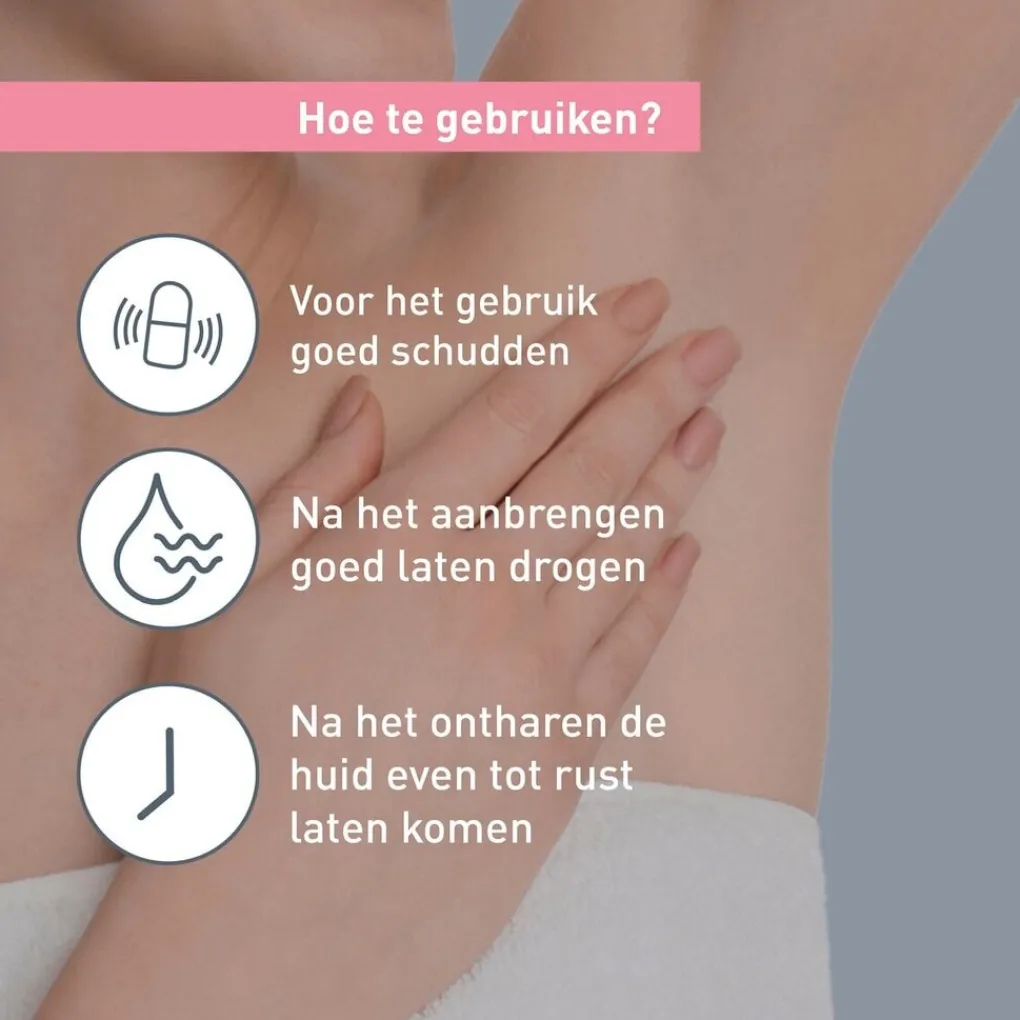 Na het aanbrengen goed laten drogen. Wil je de antitranspirant na het ontharen aanbrengen? Laat je huid dan eerst even tot rust komen.