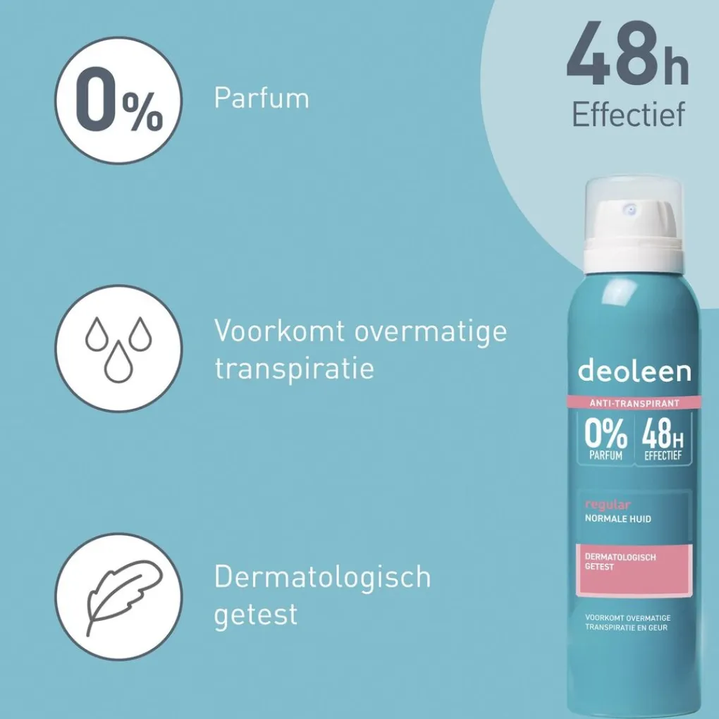 Deoleen Regular Antitranspirant Spray voorkomt 24 uur lang overmatige transpiratie en onaangename geurtjes. De hypoallergene spray bevat 0% parfum en geeft geen witte strepen op kleding. Aanbevolen door dermatologen.