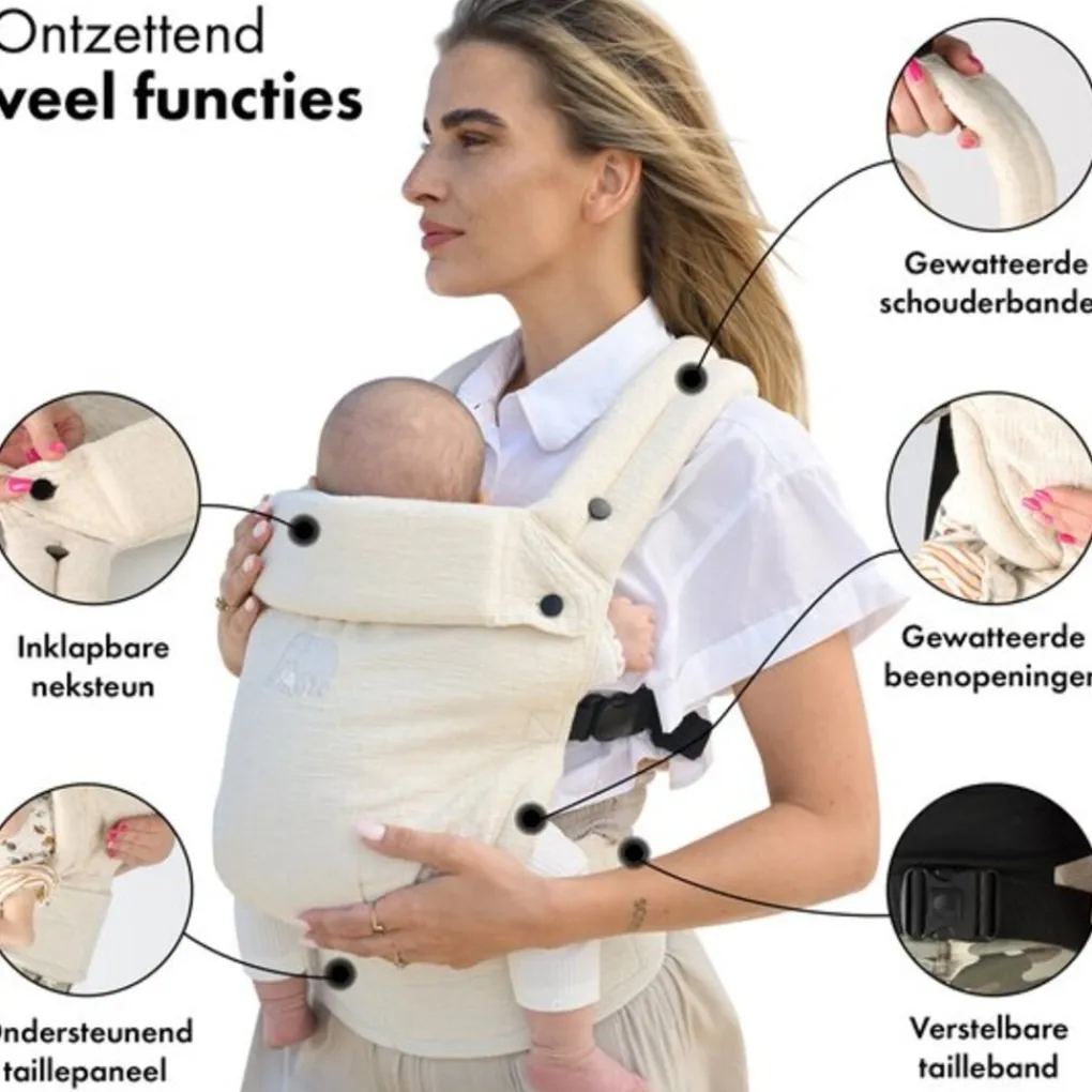 De draagzak biedt meerdere ergonomische draagposities: draag je baby met het gezicht naar je toe voor een intieme en veilige verbinding, met het gezicht naar buiten om de wereld te ontdekken, of comfortabel op je rug. Al deze opties ondersteunen een gezonde lichaamsontwikkeling van je kindje, met de juiste positie van de heupen en wervelkolom.