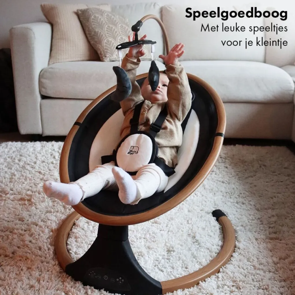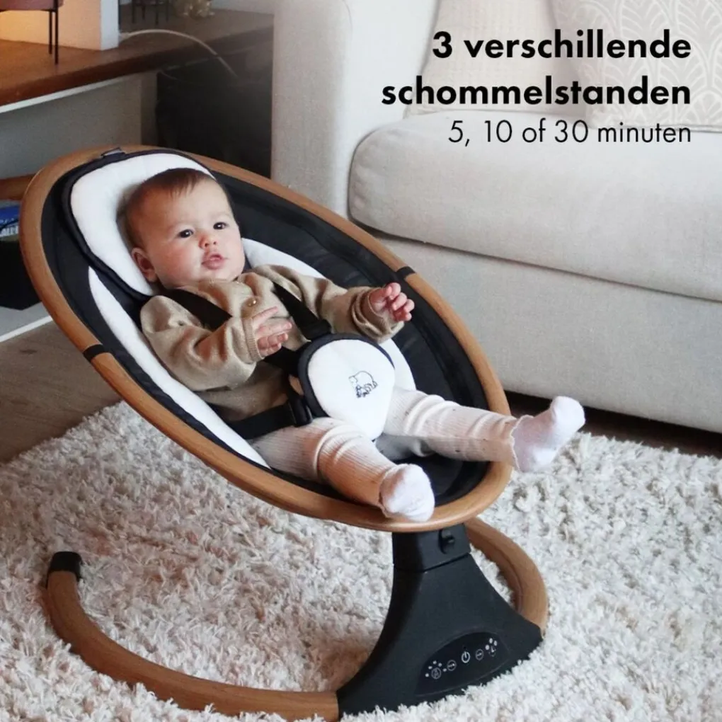 De schommelstoel heeft een luxe uitstraling door de houtlook. De stof is heerlijk zacht voor het kindje. Het kindje zit stevig vast door het harnasje met driepuntsgordel. De schommelstoel wordt ook geleverd inclusief afstandsbediening.